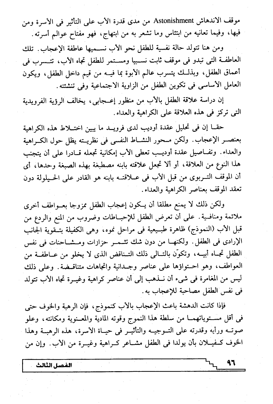 فإذا كانت الدهشة باعث الإعجاب بالأب كنموذج، فإن الرهبة والخوف حتى في أقل مستوياتهما من سلطة هذا النموذج وقوته المادية والمعنوية ومكانته، وعلو صوته ورأيه وقدرته على التوجيه والتأثير في حياة الأسرة، هذه الرهبة وهذا الخوف كفيلان بأن يولدا في الطفل مشاعر كراهية وغيره من الأب. وإن من