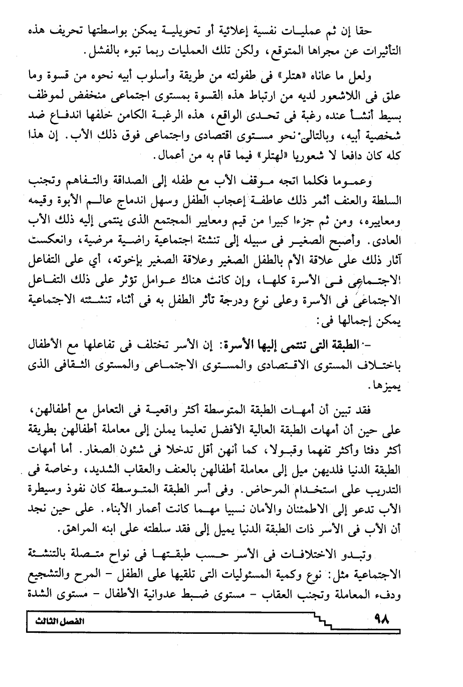 فقد تبين أن أمهات الطبقة المتوسطة أكثر واقعية في التعامل مع أطفالهن، على حين أن أمهات الطبقة العالية الأفضل تعليما يملن إلى معاملة أطفالهن بطريقة أكثر دفئا وأكثر تفهما وقبولا، كما أنهن أقل تدخلا في شئون الصغار. أما أمهات الطبقة الدنيا فلديهن ميل إلى معاملة أطفالهن بالعنف والعقاب الشديد، وخاصة في التدريب على استخدام المرحاض. وفي أسر الطبقة المتوسطة كان نفوذ وسيطرة الأب تدعو إلى الاطمئنان والأمان نسبيا مهما كانت أعمار الأبناء. على حين نجد أن الأب في الأسر ذات الطبقة الدنيا يميل إلى فقد سلطته على ابنه المراهق.