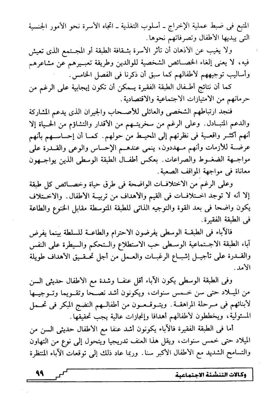 ولا يغيب عن الأذان أن تأثر الأسرة بثقافة الطبقة أو المجتمع الذي تعيش فيه، لا يعني إلغاء الخصائص الشخصية للوالدين وطريقة تعبيرهم عن مشاعرهم وأساليب توجييهم لأطفالهم كما سبق أن ذكرنا في الفصل الخامس.
