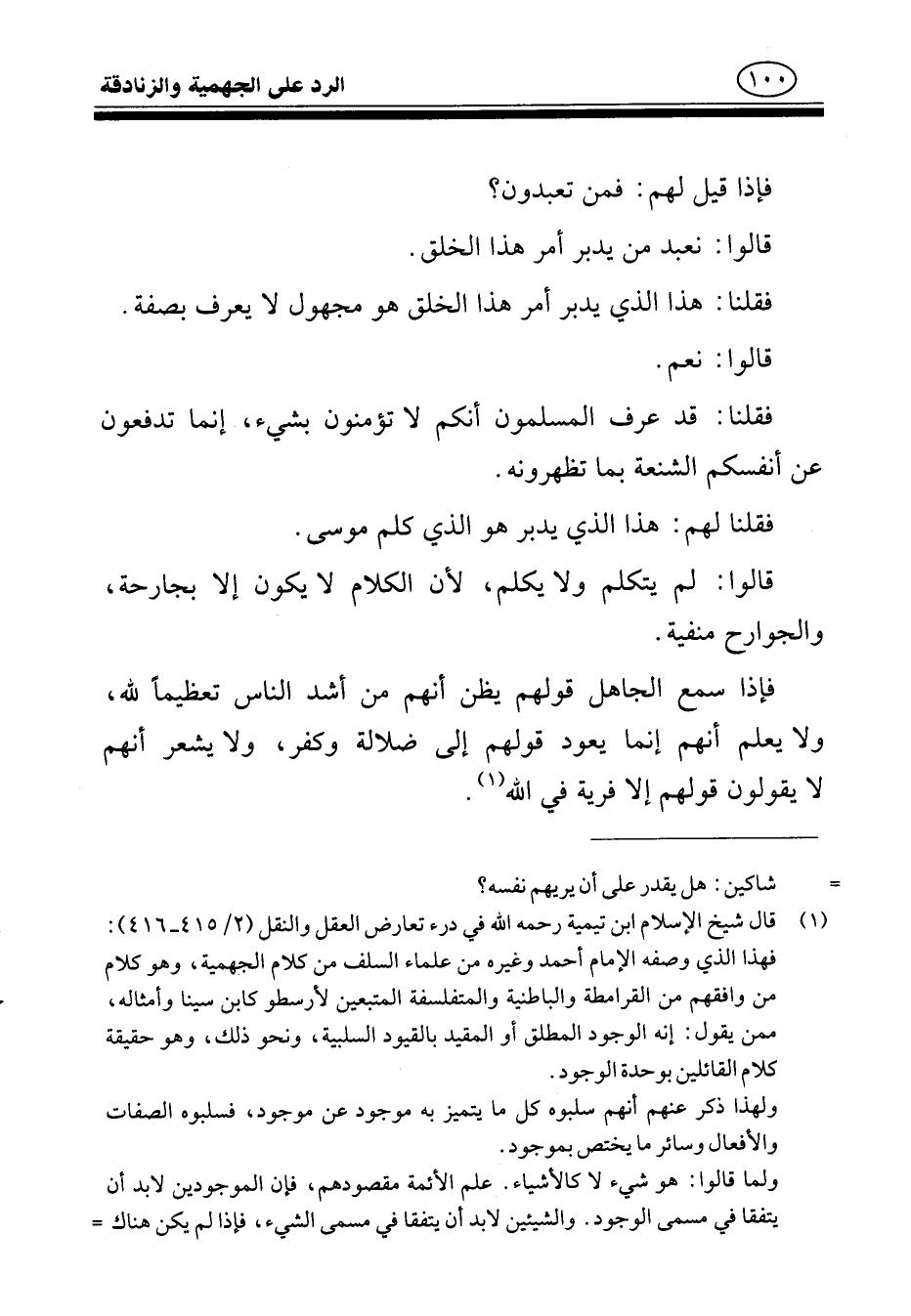 1 قال شيخ الإسلام ابن تيمية -رحمه الله- في درء تعارض العقل والنقل "415/2، 416": فهذا الذي وصفه الإمام أحمد وغيره من علماء السلف من كلام الجهمية، وهو كلام من وافقهم من القرامطة والباطنية والمتفلسفة المتبعين لأرسطو كابن سينا وأمثاله ممن يقول: إنه الوجود المطلق أو المقيد بالقيود السلبية، ونحو ذلك، وهو حقيقة كلام القائلين بوحدة الوجود.