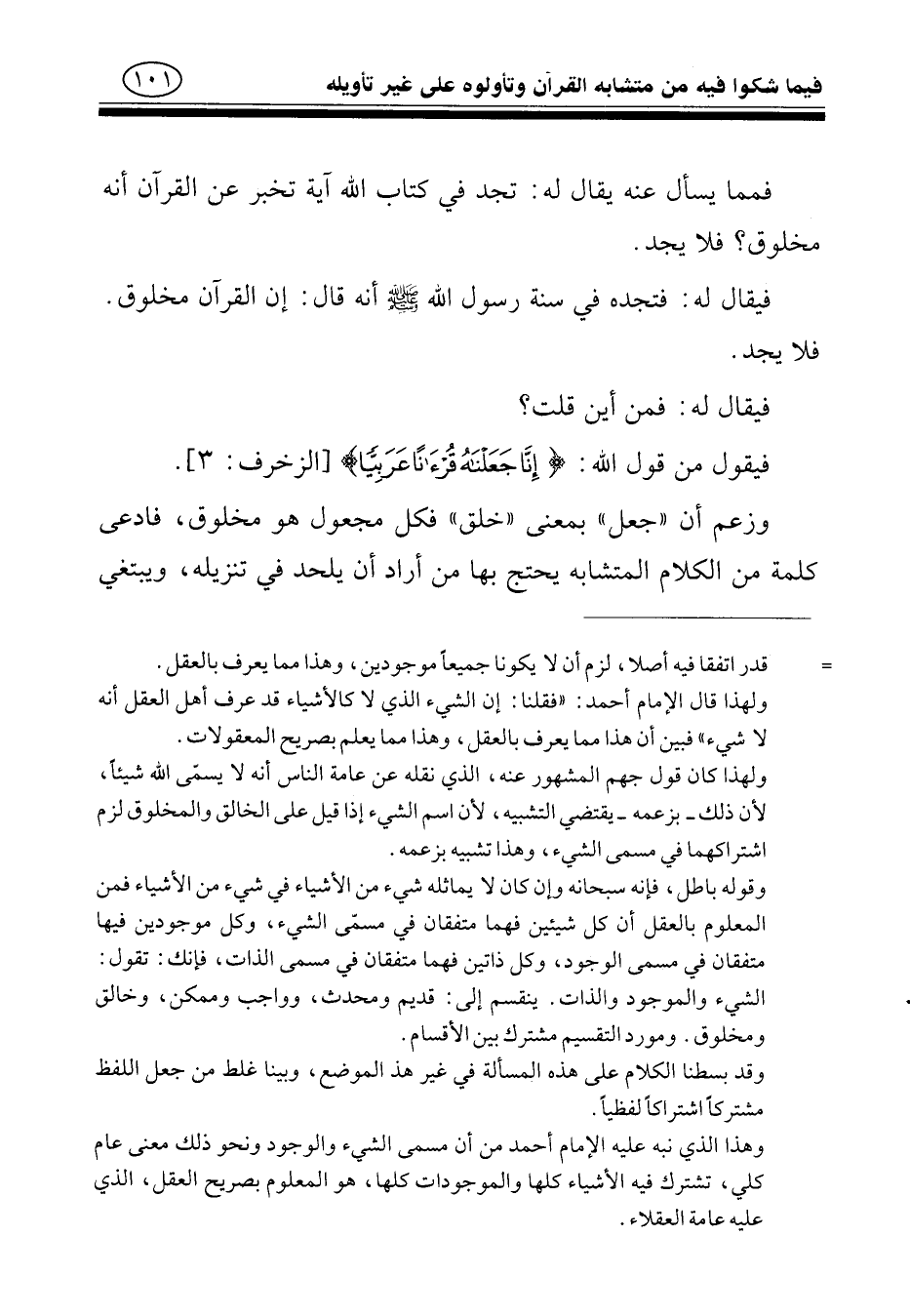 وزعم أن: جعل، بمعنى: خلق، فكل مجعول هو مخلوق، فادعى كلمة من الكلام المتشابه يحتج بها من أراد أن يلحد في تنزليه، ويبتغي