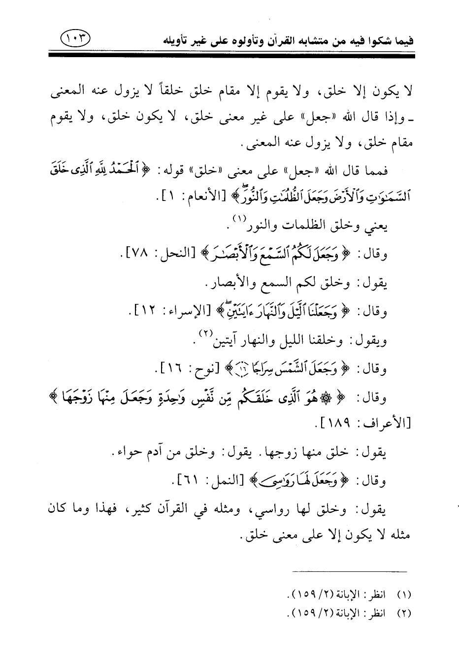 لا يكون إلا خلق، ولا يقوم إلا مقام خلق خلقًا لا يزول عنه المعنى، وإذا قال الله: جعل، على غير معنى خلق لا يكون خلق، ولا يقوم مقام الخلق، ولا يزول عنه المعنى.