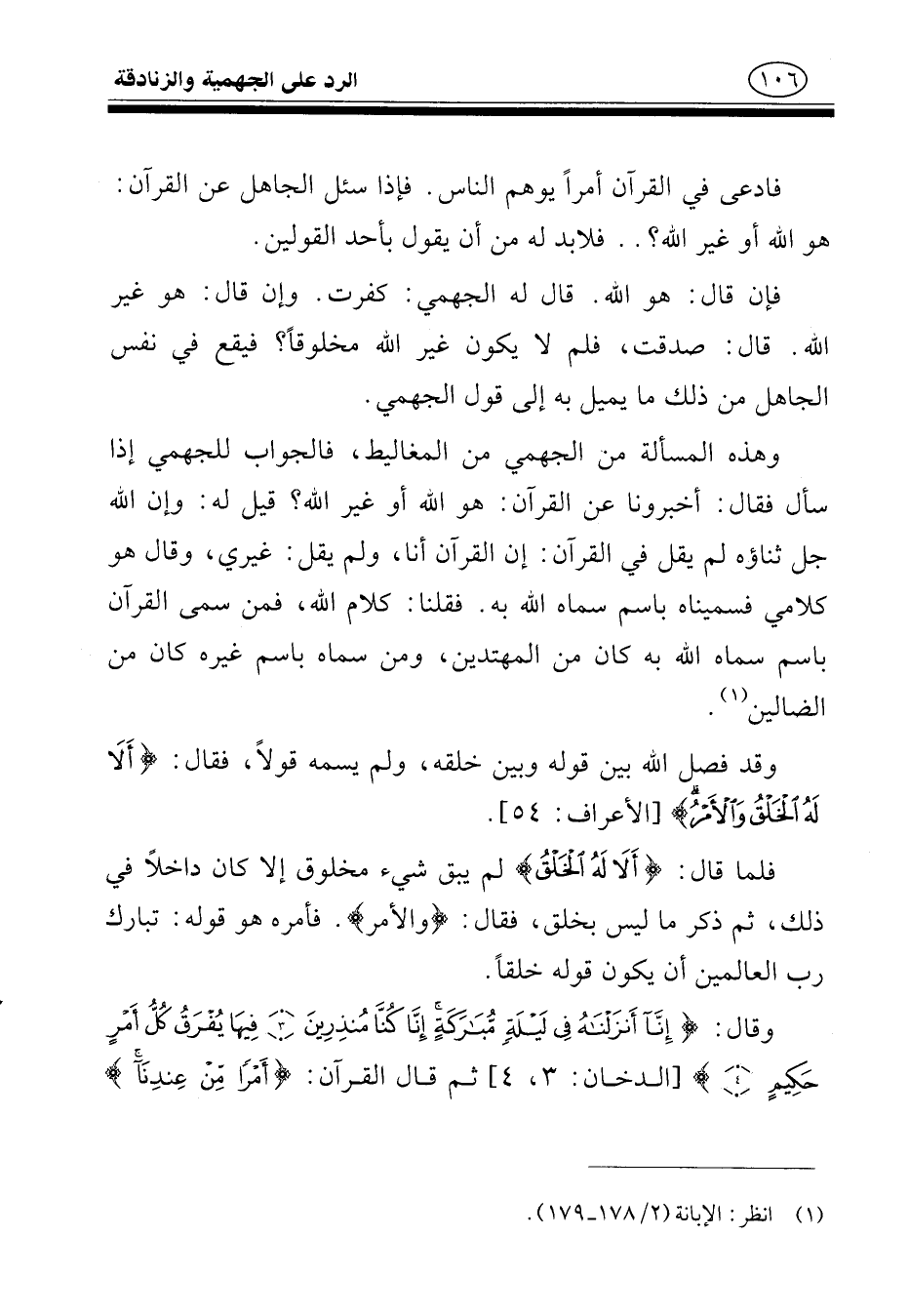 وهذه المسألة من الجهمي من المغاليط، فالجواب للجهمي إذا سأل فقال: أخبرونا عن القرآن: هو الله أو غير الله؟ قيل له: وإن الله -جل ثناؤه- لم يقل في القرآن: إن القرآن أنا، ولم يقل: غيري، وقال هو كلامي فسميناه باسم سماه الله به. فقلنا: كلام الله، فمن سمى القرآن باسم سماه الله به كان من المهتدين، ومن سماه باسم غيره كان من الضالين1.