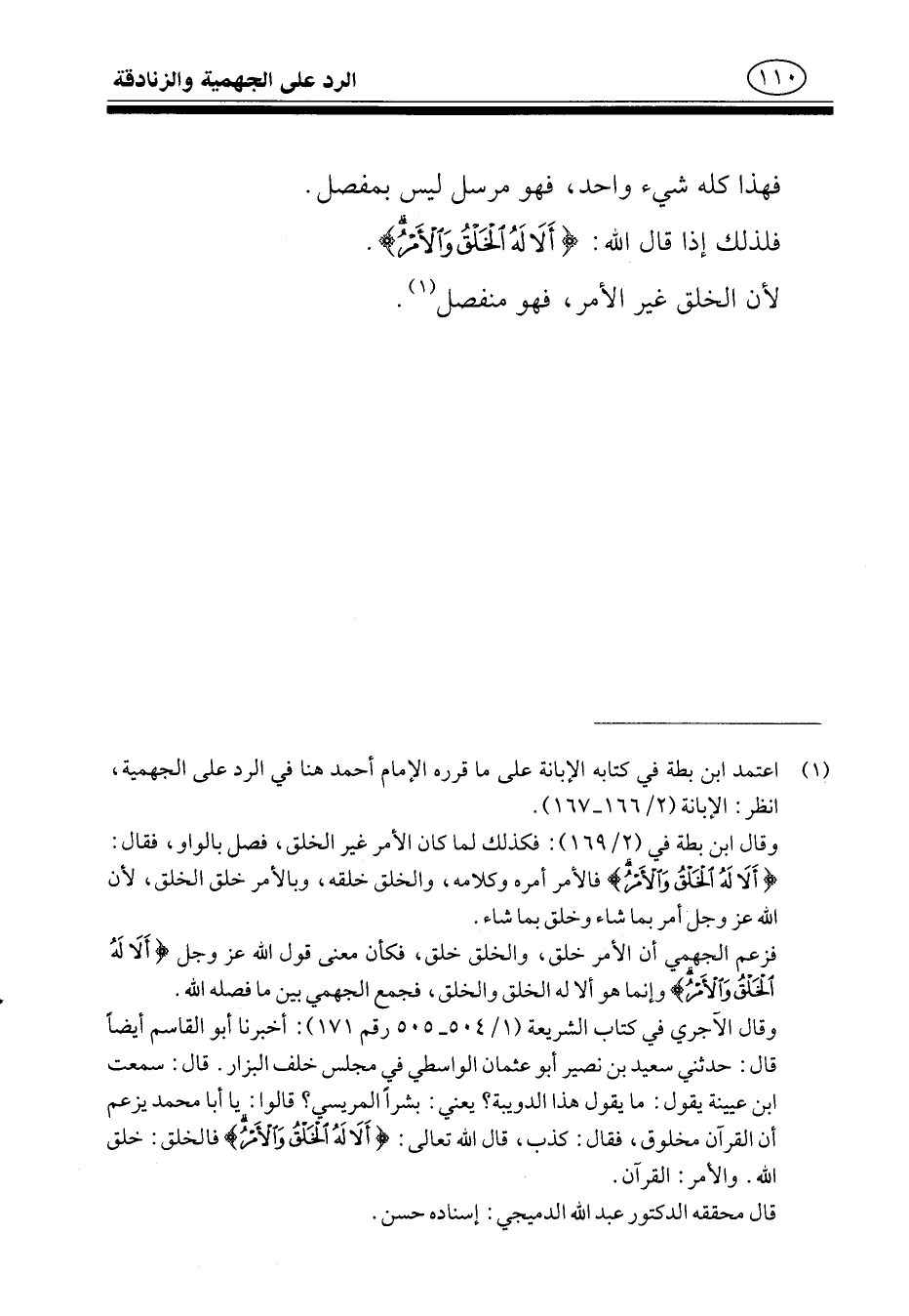 فزعم الجهمي أن الأمر خلق، والخلق خلق، فكأن معنى قول الله عز وجل: {أَلا لَهُ الْخَلْقُ وَالأَمْرُ} وإنما هو ألا له الخلق والخلق، فجمع الجهمي بين ما فصله الله.