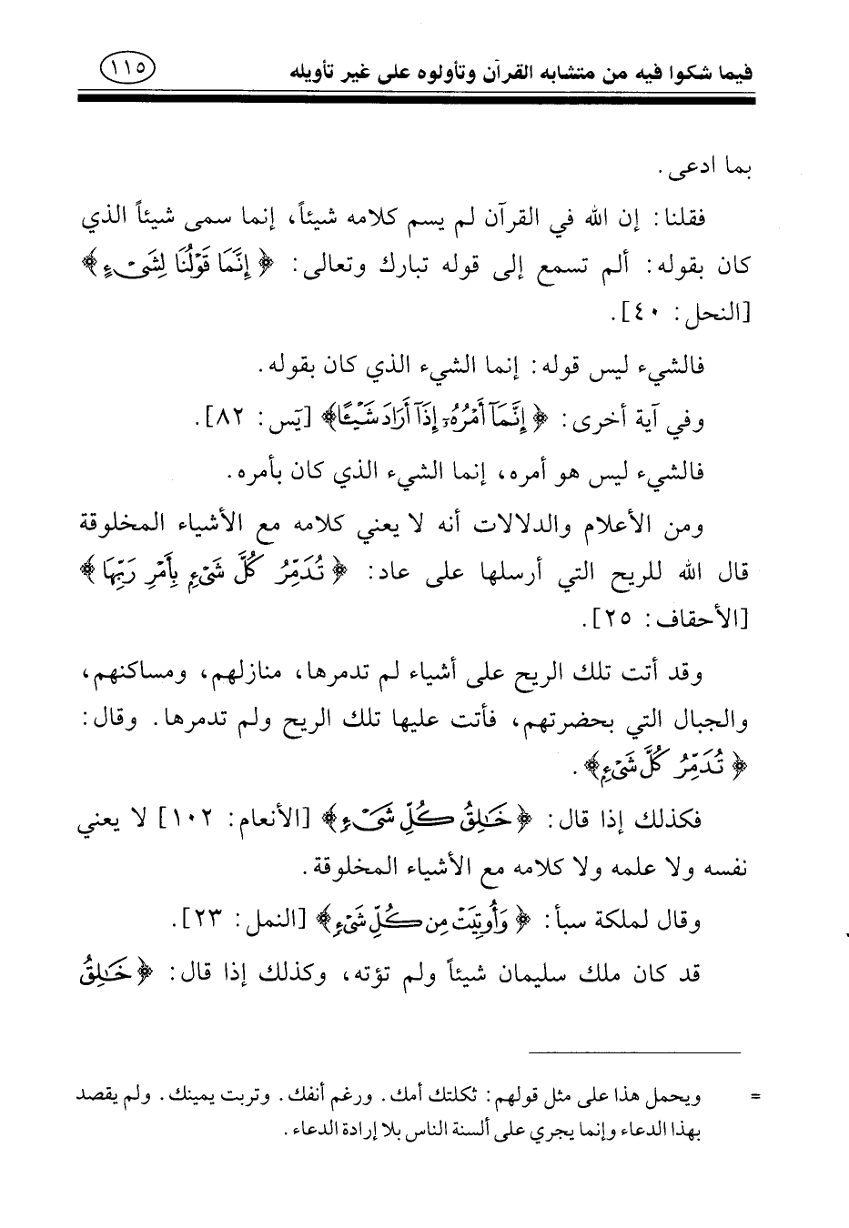 ومن الأعلام والدلالات أنه لا يعني كلامه مع الأشياء المخلوقة قال الله للريح التي أرسلها على عاد: {تُدَمِّرُ كُلَّ شَيْءٍ بِأَمْرِ رَبِّهَا} [الأحقاف: 25] .