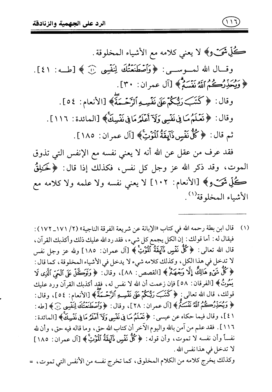 1 قال ابن بطة -رحمه الله- في كتاب "الإبانة عن شريعة الفرقة الناجية" "171/2، 172": فيقال له: أما قولك: إن الكل يجمع كل شيء، فقد رد الله عليك ذلك وأكذبك القرآن، قال الله تعالى: {كُلُّ نَفْسٍ ذَائِقَةُ الْمَوْتِ} [آل عمران: 185] ولله -عز وجل- نفس لا تدخل في هذا الكل، وكذلك كلامه شيء لا يدخل في الأشياء المخلوقة، كما قال: {كُلُّ شَيْءٍ هَالِكٌ إِلاَّ وَجْهَهُ} [القصص: 88] ، وقال: {وَتَوَكَّلْ عَلَى الْحَيِّ الَّذِي لا يَمُوتُ} [الفرقان: 58] فإن زعمت أن الله لا نفس له، لقد أكذبك القرآن ورد عليك قولك، قال الله تعالى: {كَتَبَ رَبُّكُمْ عَلَى نَفْسِهِ الرَّحْمَةَ} [الأنعام: 54] ، وقال: {وَيُحَذِّرُكُمُ اللَّهُ نَفْسَهُ} [آل عمران: 28] وقال: {وَاصْطَنَعْتُكَ لِنَفْسِي} [طه: 41] ، وقال فيما حكاه عن عيسى: {تَعْلَمُ مَا فِي نَفْسِي وَلا أَعْلَمُ مَا فِي نَفْسِكَ} [المائدة: 116] فقد علم من آمن بالله واليوم الآخر أن كتاب الله حق، وما قاله فيه حق، وأن لله نفسًا وأن نفسه لا تموت، وأن قوله: {كُلُّ نَفْسٍ ذَائِقَةُ الْمَوْتِ} [آل عمران: 185] لا تدخل في هذا نفس الله.