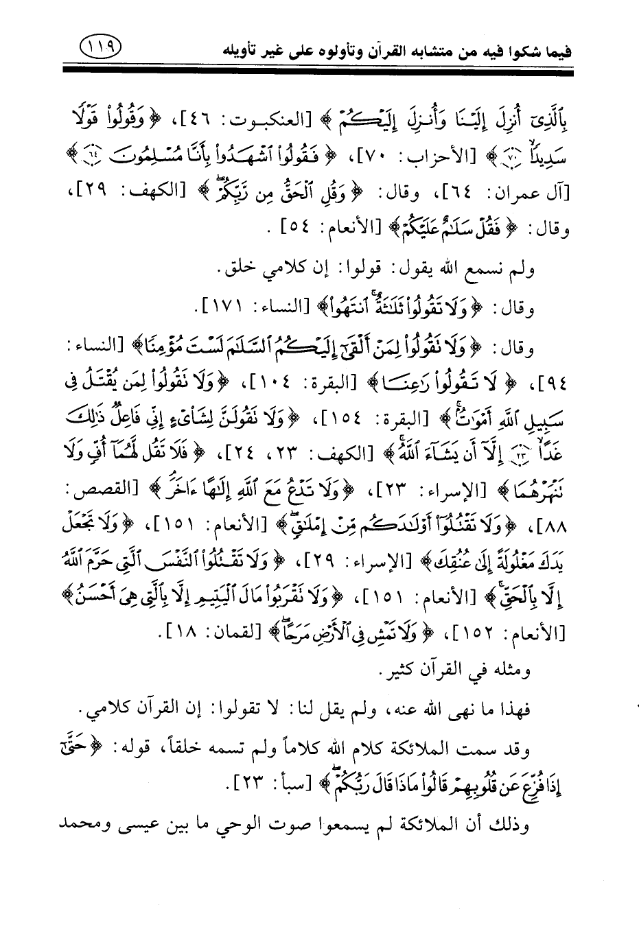 بِالَّذِي أُنْزِلَ إِلَيْنَا وَأُنْزِلَ إِلَيْكُمْ} [العنكبوت: 46] ، {وَقُولُوا قَوْلاً سَدِيدًا} [الأحزاب: 70] ، {فَقُولُوا اشْهَدُوا بِأَنَّا مُسْلِمُونَ} [آل عمران: 64] ، وقال: {وَقُلِ الْحَقُّ مِنْ رَبِّكُمْ} [الكهف: 29] ، وقال: {فَقُلْ سَلامٌ عَلَيْكُمْ} [الأنعام: 54] . ولم نسمع الله يقول: قولوا إن كلامي خلق.