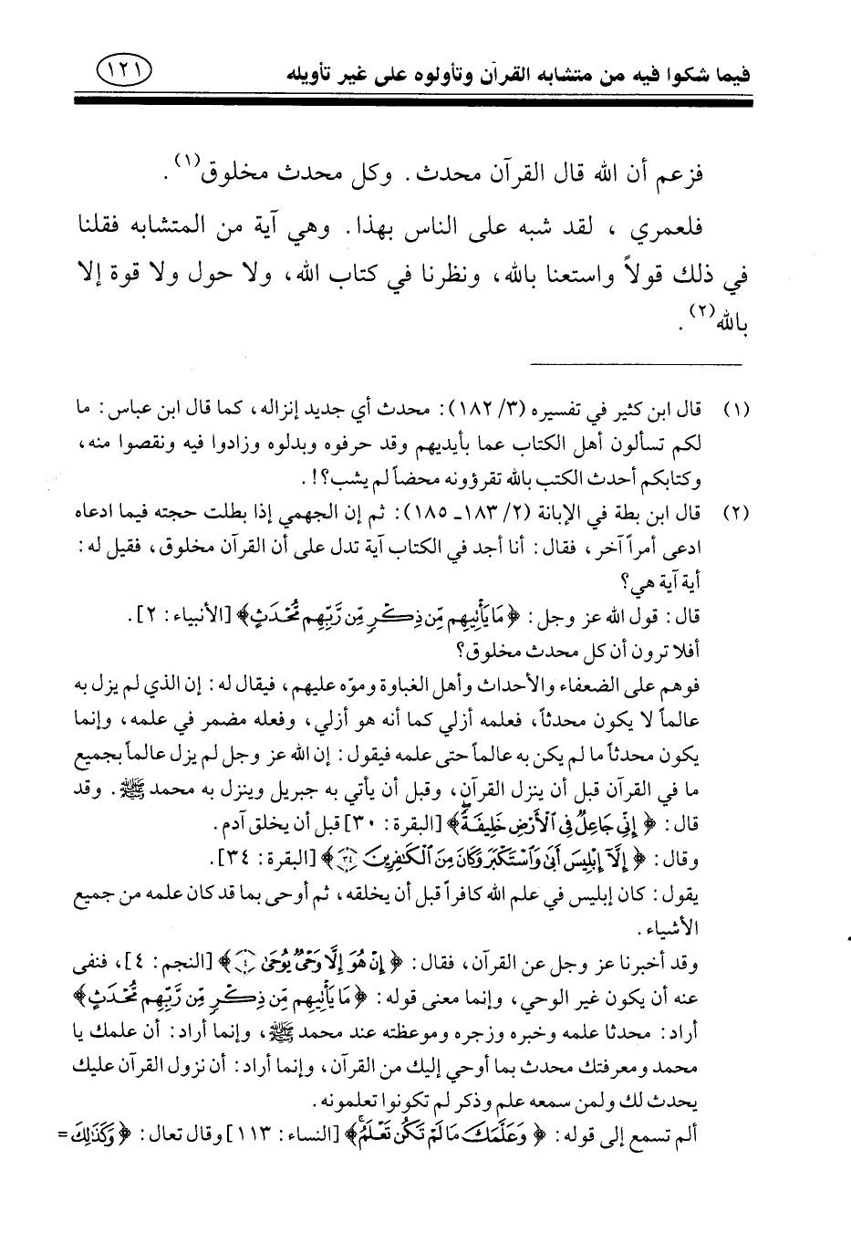 2 قال ابن بطة في "الإبانة" "183/2-185": ثم إن الجهمي إذا بطلت حجته فيما ادعاه ادعى أمرًا آخر، فقال: أنا أجد في الكتاب آية تدل على أن القرآن مخلوق، فقثيل: أية آية هي؟