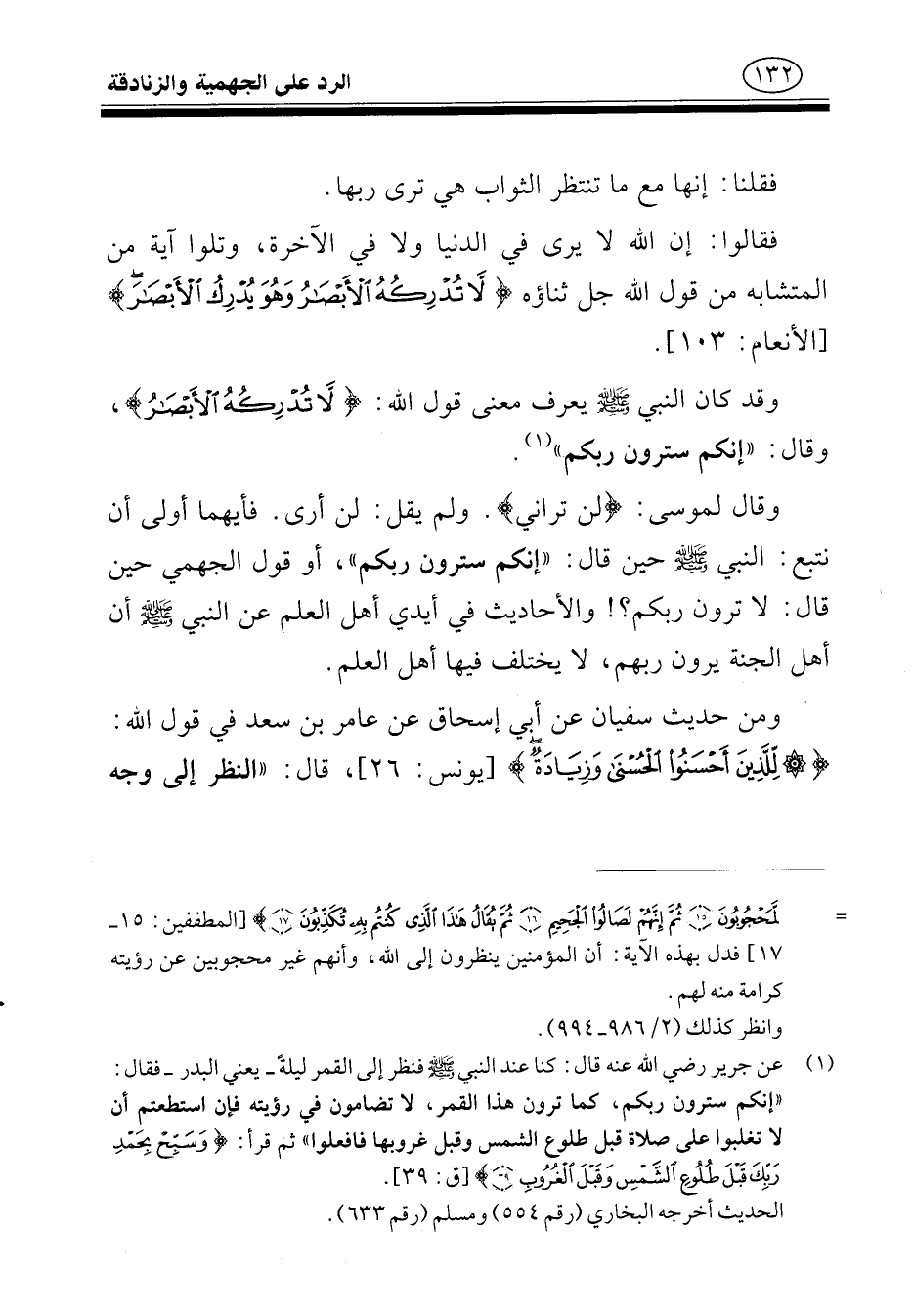 وقال لموسى: {لَنْ تَرَانِي} ، ولم يقل: لن أُرى، فأيهما أولى أن نتبع: النبي -صلى الله عليه وسلم- حين قال: "إنكم سترون ربكم" أو قول الجهمي حين قال: لا ترون ربكم؟! والأحاديث في أيدي أهل العلم عن النبي -صلى الله عليه وسلم- أن أهل الجنة يرون ربهم، لا يختلف فيها أهل العلم.