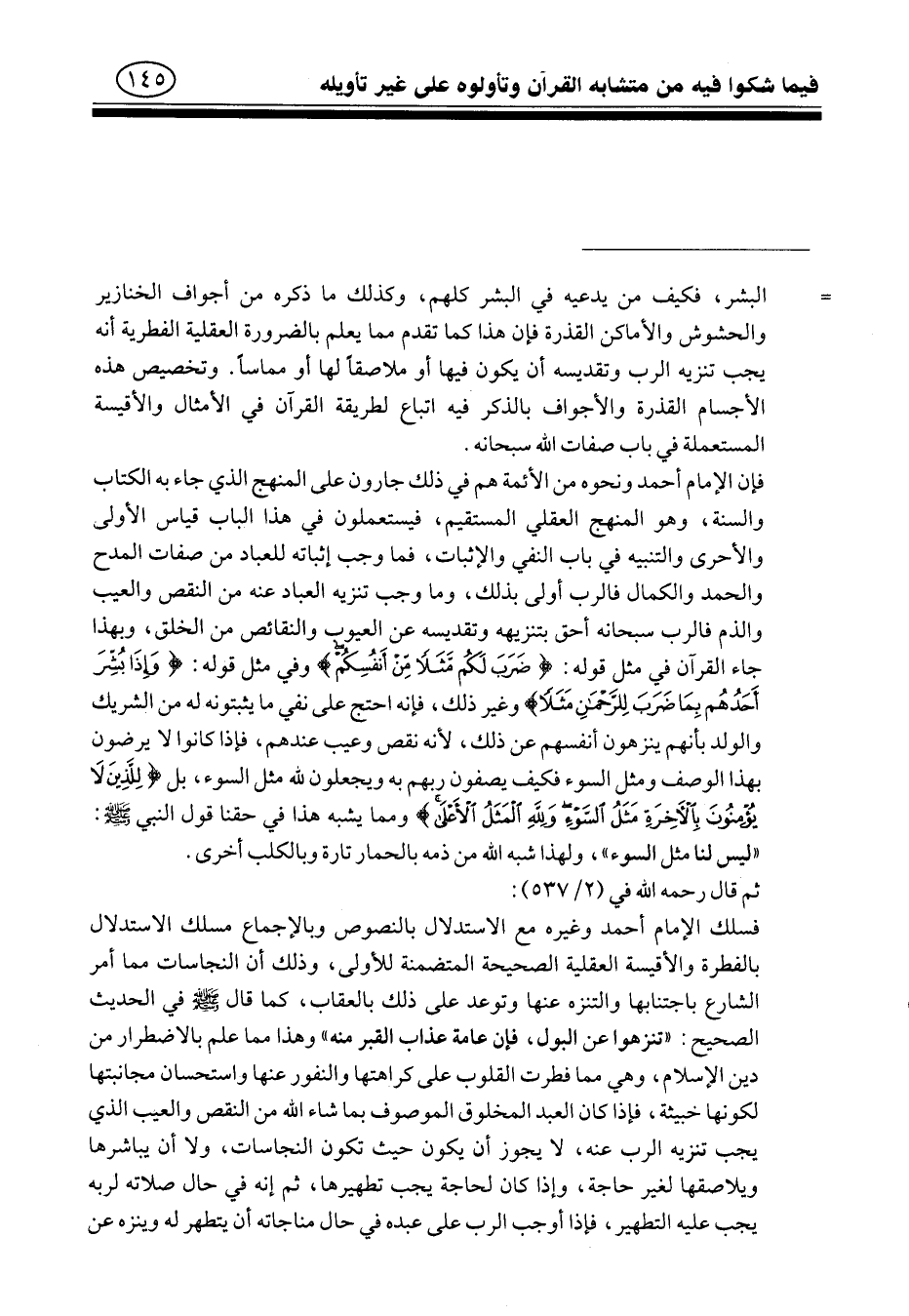 فإن الإمام أحمد ونحوه من الأئمة هم في ذلك جارون على المنهج الذي جاء به الكتاب والسنة، وهو المنهج العقلي المستقيم، فيستعملون في هذا الباب قياس الأولى والأحرى والتنبيه في باب النفي والإثبات، فما وجب إثباته للعباد من صفات المدح والحمد والكمال فالرب أولى بذلك، وما وجب تنزيه العباد عنه من النقص والعيب والذم فالرب سبحانه أحق بتنزيهه وتقديسه عن العيوب والنقائص من الخلق، وبهذا جاء القرآن في مثل قوله: {ضَرَبَ لَكُمْ مَثَلاً مِنْ أَنْفُسِكُمْ} وفي مثل قوله: {وَإِذَا بُشِّرَ أَحَدُهُمْ بِمَا ضَرَبَ لِلرَّحْمَنِ مَثَلاً} وغير ذلك، فإنه احتج على نفي ما يثبتونه له من الشريك والولد بأنهم ينزهون أنفسهم عن ذلك؛ لأنه نقص وعيب عندهم، فإذا كانوا لا يرضون بهذا الوصف ومثل السوء، فكيف يصفون ربهم به ويجعلون لله مثل السوء، بل: {لِلَّذِينَ لا يُؤْمِنُونَ بِالآخِرَةِ مَثَلُ السَّوْءِ وَلِلَّهِ الْمَثَلُ الأَعْلَى} ومما يشبه هذا في حقنا قول النبي صلى الله عليه وسلم: "ليس لنا مثل السوء" ولهذا شبه الله من ذمه بالحمار تارة وبالكلب أخرى.
