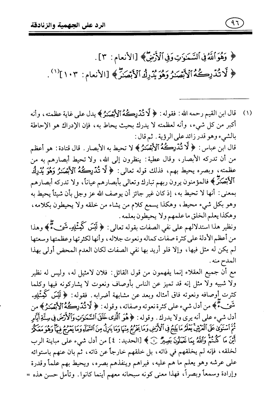 1 قال ابن القيم رحمه الله: فقوله: {لا تُدْرِكُهُ الأَبْصَارُ} يدل على غاية عظمته، وأنه أكبر من كل شيء، وأنه لعظمته لا يدرك بحيث يحاط به، فإن الإدراك هو الإحاطة بالشيء وهو قدر زائد على الرؤية. ثم قال: