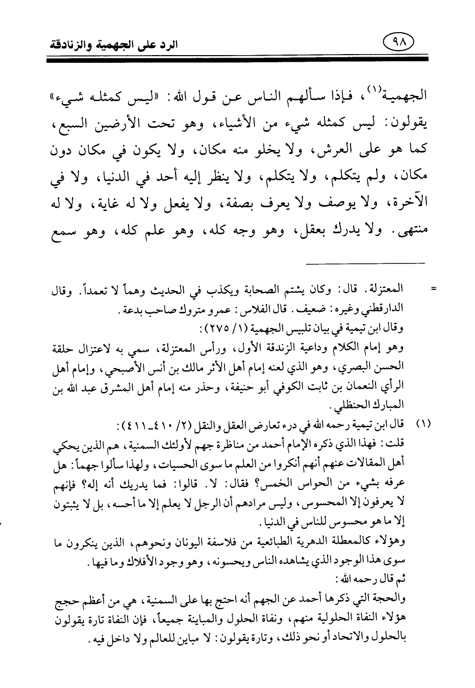 قلت: فهذا الذي ذكره الإمام أحمد في مناظرة جهم لأولئك السمنية، هم الذين يحكي أهل المقالات عنهم أنهم أنكروا من العلم ما سوى الحسيات، ولهذا سألوا جهمًا: هل عرفه بشيء من الحواس الخمس؟ فقال: لا. قالوا: فما يدريك أنه إله؟ فإنهم لا يعرفون إلا المحسوس، وليس مرادهم أن الرجل لا يعلم إلا ما أحسه، بل لا يثبتون إلا ما هو محسوس للناس في الدنيا.