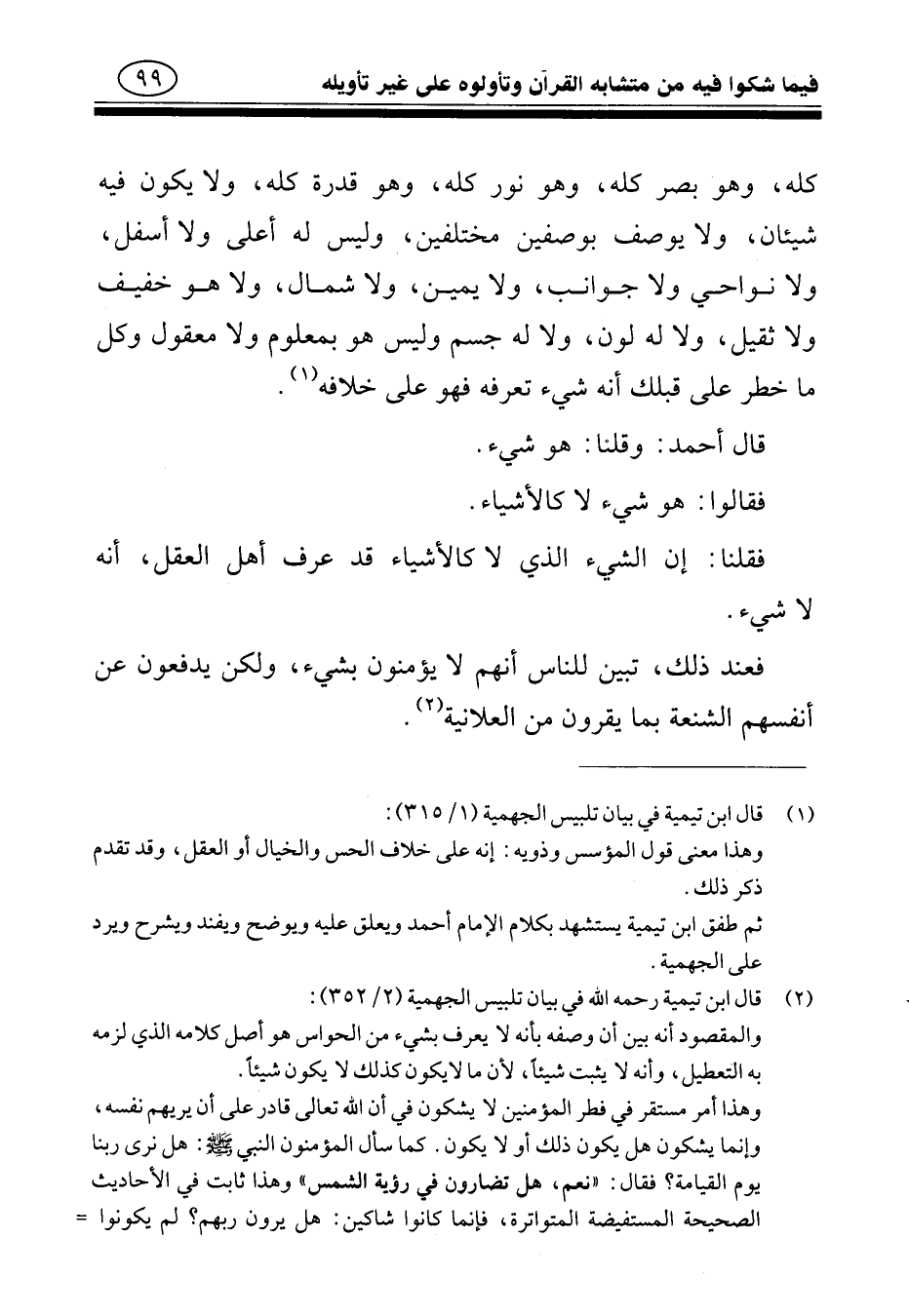 2 قال ابن تيمية -رحمه الله- في بيان تلبيس الجهمية "352/2": والمقصود أنه بَيَّنَ أن وصفه بأنه لا يعرف بشيء من الحواس هو أصل كلامه الذي لزمه به التعطيل، وأنه لا يثبت شيئًا، لأن ما لا يكون كذلك لا يكون شيئًا.