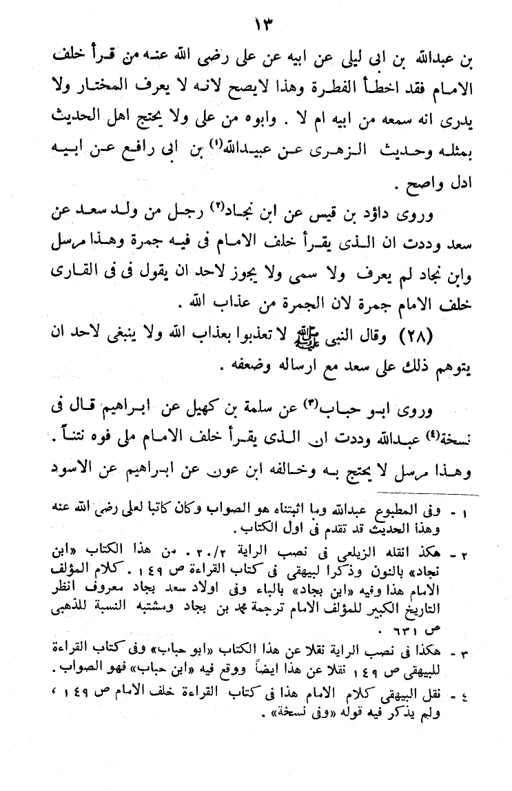 بْنِ عَبْدِ اللَّهِ بْنِ أَبِي لَيْلَى، عَنْ أَبِيهِ، رَضِيَ اللَّهُ عَنْهُ: «مَنْ قَرَأَ خَلْفَ الْإِمَامِ فَقَدْ أَخْطَأَ الْفِطْرَةَ» وَهَذَا لَا يَصِحُّ لِأَنَّهُ لَا يَعْرِفُ الْمُخْتَارَ وَلَا يُدْرَى أَنَّهُ سَمِعَهُ مِنْ أَبِيهِ أَمْ لَا؟ وَأَبُوهُ مِنْ عَلِيٍّ، وَلَا يَحْتَجُّ أَهْلُ الْحَدِيثِ بِمِثْلِهِ، وَحَدِيثُ الزُّهْرِيِّ، عَنْ عَبْدِ اللَّهِ بْنِ أَبِي رَافِعٍ، عَنْ أَبِيهِ، أَدَلُّ وَأَصَحُّ وَرَوَى دَاوُدُ بْنُ قَيْسٍ، عَنِ ابْنِ نَجَادٍ، رَجُلٍ مِنْ وَلَدِ سَعْدٍ، عَنْ سَعْدٍ، «وَدِدْتُ أَنَّ الَّذِي يَقْرَأُ خَلْفَ الْإِمَامِ فِي فِيهِ جَمْرَةٌ» وَهَذَا مُرْسَلٌ وَابْنُ نَجَادٍ لَمْ يُعْرَفْ وَلَا سُمِّيَ وَلَا يَجُوزُ لِأَحَدٍ أَنْ يَقُولَ فِي الْقَارِئِ خَلْفَ الْإِمَامِ جَمْرَةٌ مِنْ عَذَابِ اللَّهِ وَقَالَ النَّبِيُّ صَلَّى اللَّهُ عَلَيْهِ وَسَلَّمَ: «لَا تُعَذِّبُوا بِعَذَابِ اللَّهِ» ، وَلَا يَنْبَغِي لِأَحَدٍ أَنْ يُتَوَهَّمَ ذَلِكَ عَلَى سَعْدٍ مَعَ إِرْسَالِهِ وَضَعْفِهِ وَرَوَى أَبُو حُبَابٍ، عَنْ سَلَمَةَ بْنِ كُهَيْلٍ، عَنْ إِبْرَاهِيمَ، قَالَ فِي نُسْخَةِ عَبْدِ اللَّهِ: " وَوَدِتُ أَنَّ الَّذِي يَقْرَأُ خَلْفَ الْإِمَامِ مُلِئَ فُوهُ نَتِنًا وَهَذَا مُرْسَلٌ لَا يُحْتَجُّ بِهِ وَخَالَفَهُ ابْنُ عَوْنٍ عَنْ إِبْرَاهِيمَ الْأَسْوَدِ