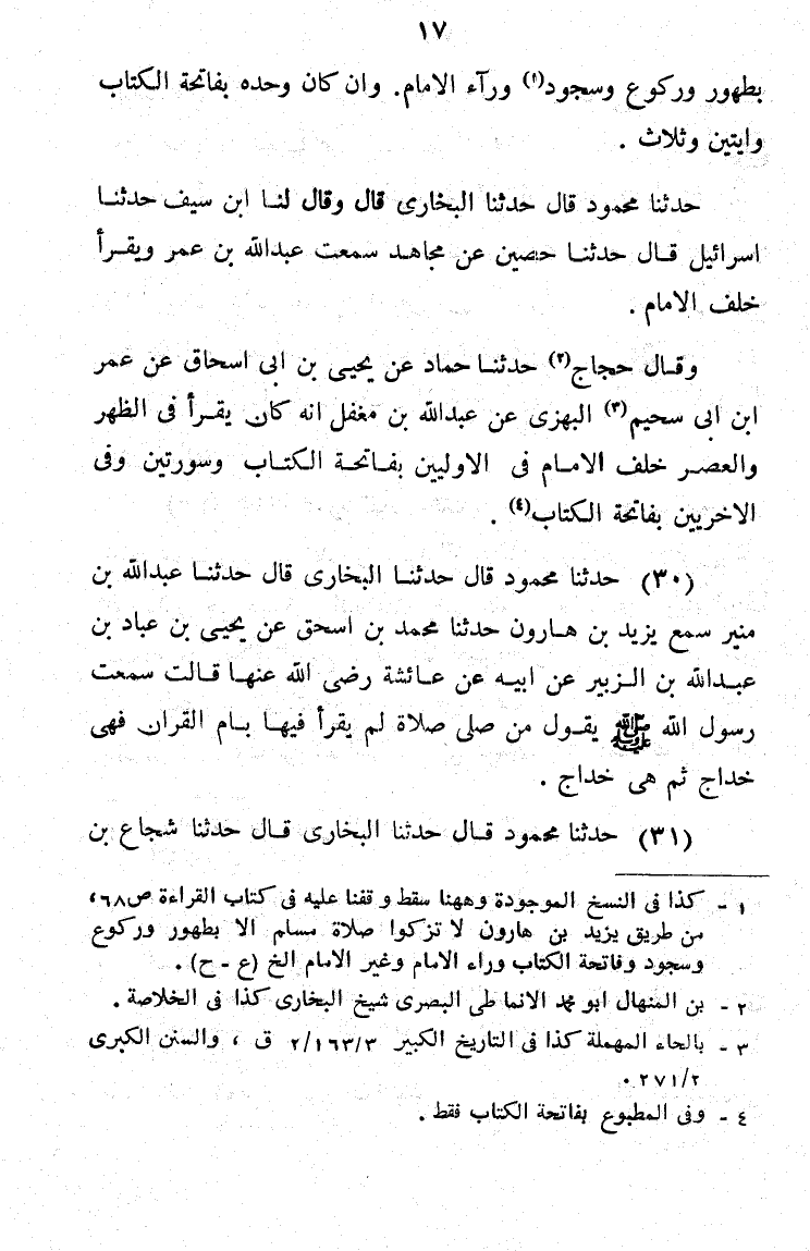 30 - حَدَّثَنَا مَحْمُودُ قَالَ: حَدَّثَنَا الْبُخَارِيُّ قَالَ، وقَالَ لَنَا ابْنُ سَيْفٍ، حَدَّثَنَا إِسْرَائِيلُ، قَالَ: حَدَّثَنَا حُصَيْنٌ، عَنْ مُجَاهِدٍ، سَمِعْتُ عَبْدَ اللَّهِ بْنَ عَمْرٍو، «§يَقْرَأُ خَلْفَ الْإِمَامِ»