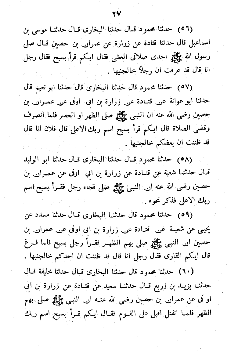 64 - حَدَّثَنَا مَحْمُودٌ قَالَ: حَدَّثَنَا الْبُخَارِيُّ قَالَ: حَدَّثَنَا أَبُو نُعَيْمٍ، قَالَ: حَدَّثَنَا أَبُو عَوَانَةَ، عَنْ قَتَادَةَ، عَنْ زُرَارَةَ بْنِ أَبِي أَوْفَى، عَنْ عِمْرَانَ بْنِ حُصَيْنٍ، رَضِيَ اللَّهُ عَنْهُ أَنَّ النَّبِيَّ صَلَّى اللَّهُ عَلَيْهِ وَسَلَّمَ صَلَّى الظُّهْرَ أَوِ الْعَصْرَ، فَلَمَّا انْصَرَفَ وَقَضَى الصَّلَاةَ قَالَ: «§أَيُّكُمْ قَرَأَ بِسَبِّحِ اسْمَ رَبِّكَ الْأَعْلَى؟» قَالَ: فُلَانٌ قَالَ: قَدْ ظَنَنْتُ أَنَّ بَعْضَكُمْ خَالَجَنِيهَا " حَدَّثَنَا مَحْمُودٌ قَالَ: حَدَّثَنَا الْبُخَارِيُّ قَالَ: حَدَّثَنَا أَبُو الْوَلِيدِ، قَالَ: حَدَّثَنَا شُعْبَةُ، عَنْ قَتَادَةَ، عَنْ زُرَارَةَ بْنِ أَبِي أَوْفَى، عَنْ عِمْرَانَ بْنِ حُصَيْنٍ، رَضِيَ اللَّهُ عَنْهُ أَنَّ النَّبِيَّ صَلَّى اللَّهُ عَلَيْهِ وَسَلَّمَ صَلَّى فَجَاءَ رَجُلٌ فَقَرَأَ بـ سَبِّحِ اسْمَ رَبِّكَ الْأَعْلَى، فَذَكَرَ نَحْوَهُ