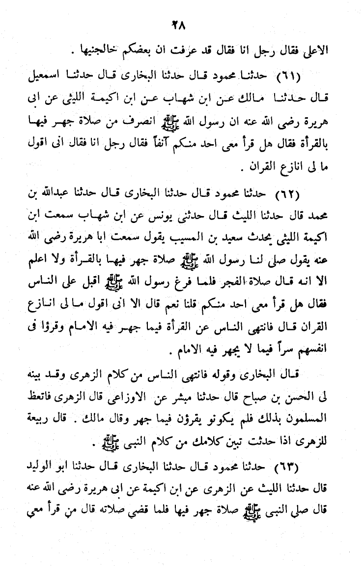 68 - حَدَّثَنَا مَحْمُودٌ قَالَ: حَدَّثَنَا الْبُخَارِيُّ قَالَ: حَدَّثَنَا عَبْدُ اللَّهِ بْنُ مُحَمَّدٍ، قَالَ: حَدَّثَنَا اللَّيْثُ، قَالَ: حَدَّثَنِي يُونُسُ، عَنِ ابْنِ شِهَابٍ، سَمِعْتُ ابْنَ أُكَيْمَةَ اللَّيْثِيَّ، يُحَدِّثُ سَعِيدَ بْنَ الْمُسَيِّبِ، يَقُولُ: سَمِعْتُ أَبَا هُرَيْرَةَ، رَضِيَ اللَّهُ عَنْهُ يَقُولُ: صَلَّى لَنَا رَسُولُ اللَّهِ صَلَّى اللَّهُ عَلَيْهِ وَسَلَّمَ صَلَاةً جَهَرَ فِيهَا بِالْقِرَاءَةِ، وَلَا أَعْلَمُ إِلَّا أَنَّهُ قَالَ: صَلَاةَ الْفَجْرِ، فَلَمَّا فَرَغَ رَسُولُ اللَّهِ صَلَّى اللَّهُ عَلَيْهِ وَسَلَّمَ أَقْبَلَ عَلَى النَّاسِ، فَقَالَ: «§هَلْ قَرَأَ مَعِيَ أَحَدٌ مِنْكُمْ؟» قُلْنَا: نَعَمْ قَالَ: «أَلَا إِنِّي أَقُولُ مَا لِي أُنَازَعُ الْقُرْآنَ؟» قَالَ: فَانْتَهَى النَّاسُ عَنِ الْقِرَاءَةِ فِيمَا جَهَرَ فِيهِ الْإِمَامُ وَقَرَؤُوا فِي أَنْفُسِهِمْ سِرًّا فِيمَا لَا يَجْهَرُ فِيهِ الْإِمَامُ. قَالَ الْبُخَارِيُّ: وَقَوْلُهُ فَانْتَهَى النَّاسُ مِنْ كَلَامِ الزُّهْرِيِّ، وَقَدْ بَيَّنَهُ لِي الْحَسَنُ بْنُ صَبَاحٍ قَالَ: حَدَّثَنَا مُبَشِّرٌ، عَنِ الْأَوْزَاعِيِّ قَالَ الزُّهْرِيُّ: فَاتَّعَظَ الْمُسْلِمُونَ بِذَلِكَ فَلَمْ يَكُونُوا يَقْرَؤونَ فِيمَا جُهِرَ. وَقَالَ مَالِكٌ: قَالَ رَبِيعَةُ لِلزُّهْرِيِّ: إِذَا حَدَّثْتَ فَبَيِّنْ كَلَامَكَ مِنْ كَلَامِ النَّبِيِّ صَلَّى اللَّهُ عَلَيْهِ وَسَلَّمَ