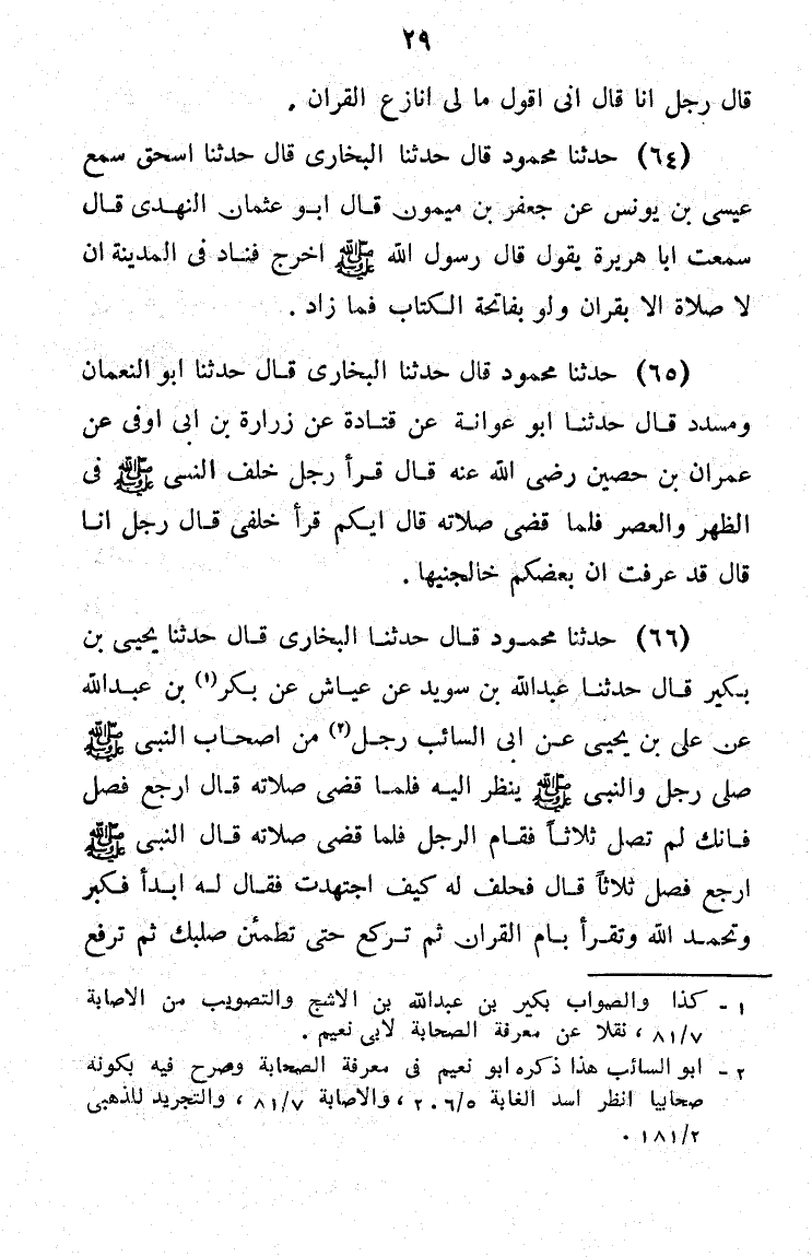 71 - حَدَّثَنَا مَحْمُودٌ قَالَ: حَدَّثَنَا الْبُخَارِيُّ قَالَ: حَدَّثَنَا أَبُو النُّعْمَانِ، وَمُسَدَّدٌ، قَالَ: حَدَّثَنَا أَبُو عَوَانَةَ، عَنْ قَتَادَةَ، عَنْ زُرَارَةَ بْنِ أَبِي أَوْفَى، عَنْ عِمْرَانَ بْنِ حُصَيْنٍ، رَضِيَ اللَّهُ عَنْهُ قَالَ: قَرَأَ رَجُلٌ خَلْفَ النَّبِيِّ صَلَّى اللَّهُ عَلَيْهِ وَسَلَّمَ فِي الظُّهْرِ وَالْعَصْرِ، فَلَمَّا قَضَى صَلَاتَهُ قَالَ: «§أَيُّكُمْ قَرَأَ خَلْفِي؟» قَالَ رَجُلٌ: أَنَا قَالَ: «قَدْ عَرَفْتُ أَنَّ بَعْضَكُمْ خَالَجَنِيهَا»