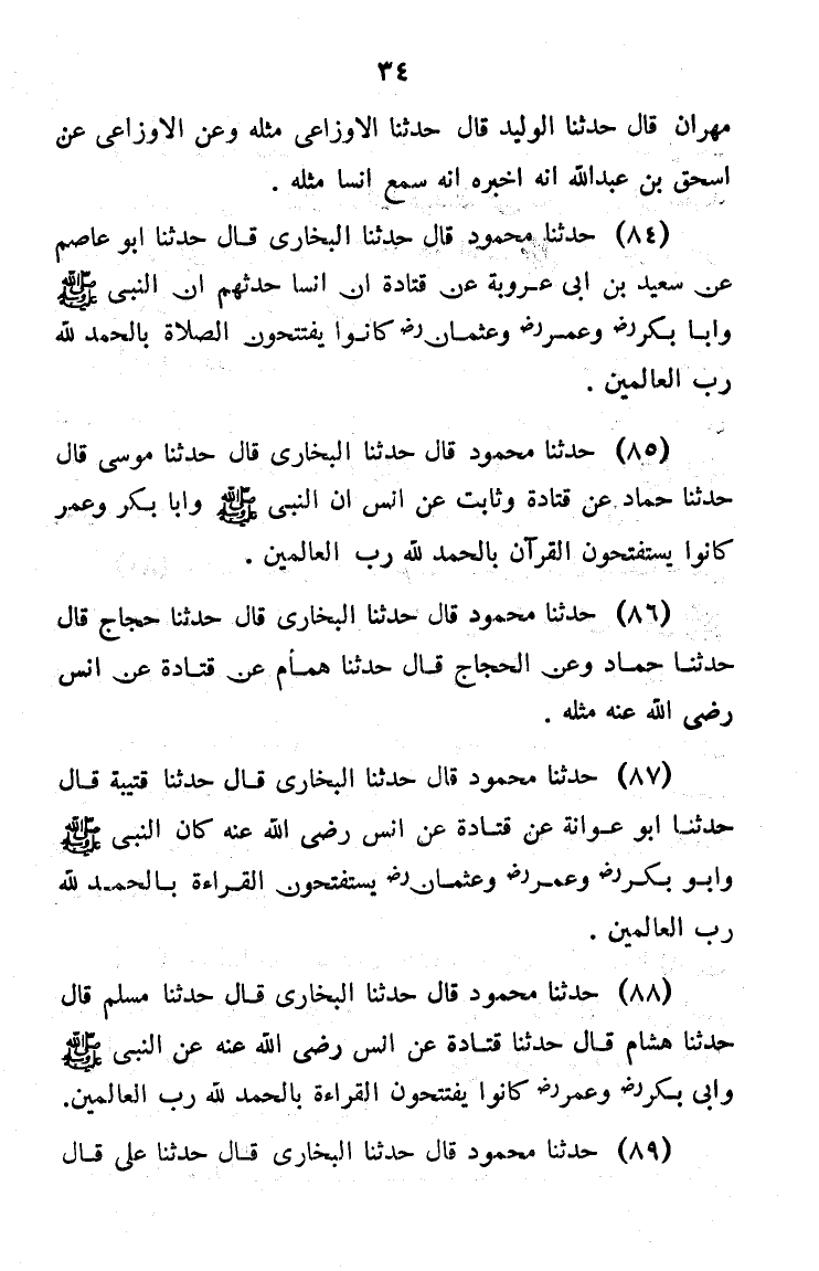 89 - حَدَّثَنَا مَحْمُودٌ قَالَ: حَدَّثَنَا الْبُخَارِيُّ قَالَ: حَدَّثَنَا قُتَيْبَةُ، قَالَ: حَدَّثَنَا أَبُو عَوَانَةَ، عَنْ قَتَادَةَ، عَنْ أَنَسٍ، رَضِيَ اللَّهُ عَنْهُ «كَانَ النَّبِيُّ صَلَّى اللَّهُ عَلَيْهِ وَسَلَّمَ وَأَبُو بَكْرٍ وَعُمَرَ وَعُثْمَانَ §يَسْتَفْتِحُونَ الْقِرَاءَةَ بِالْحَمْدِ لِلَّهِ رَبِّ الْعَالَمِينَ»