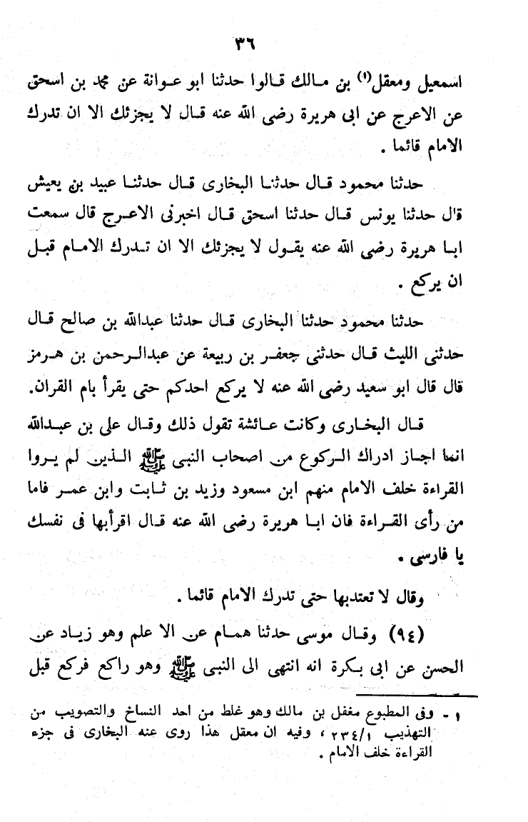 95 - حَدَّثَنَا مَحْمُودٌ قَالَ: حَدَّثَنَا الْبُخَارِيُّ قَالَ: حَدَّثَنَا عَبْدُ اللَّهِ بْنُ صَالِحٍ، قَالَ: حَدَّثَنِي اللَّيْثُ، قَالَ: حَدَّثَنِي جَعْفَرُ بْنُ رَبِيعَةَ، عَنْ عَبْدِ الرَّحْمَنِ بْنِ هُرْمُزَ، قَالَ: قَالَ أَبُو سَعِيدٍ رَضِيَ اللَّهُ عَنْهُ: «§لَا يَرْكَعْ أَحَدُكُمْ حَتَّى يَقْرَأَ بِأُمِّ الْقُرْآنِ» . قَالَ الْبُخَارِيُّ: وَكَانَتْ عَائِشَةُ تَقُولُ ذَلِكَ، وَقَالَ عَلِيُّ بْنُ عَبْدِ اللَّهِ: إِنَّمَا أَجَازَ إِدْرَاكَ الرُّكُوعِ مِنْ أَصْحَابِ النَّبِيِّ صَلَّى اللَّهُ عَلَيْهِ وَسَلَّمَ الَّذِينَ لَمْ يَرَوُا الْقِرَاءَةَ خَلْفَ الْإِمَامِ مِنْهُمُ ابْنُ مَسْعُودٍ، وَزَيْدُ بْنُ ثَابِتٍ، وَابْنُ عُمَرَ، فَأَمَّا مَنْ رَأَى الْقِرَاءَةَ فَإِنَّ أَبَا هُرَيْرَةَ رَضِيَ اللَّهُ عَنْهُ قَالَ: اقْرَأْ بِهَا فِي نَفْسِكَ يَا فَارِسِيُّ وَقَالَ: لَا تَعْتَدَّ بِهَا حَتَّى تُدْرِكَ الْإِمَامَ قَائِمًا