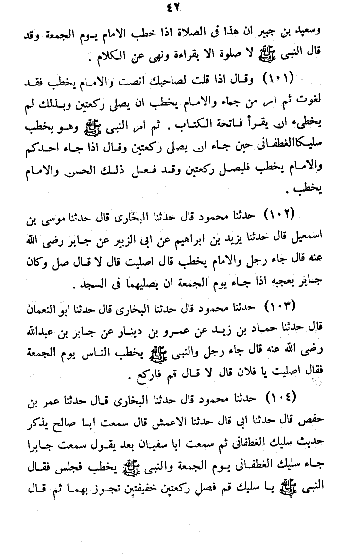 101 - حَدَّثَنَا مَحْمُودٌ قَالَ: حَدَّثَنَا الْبُخَارِيُّ قَالَ: حَدَّثَنَا أَبُو النُّعْمَانِ، قَالَ: حَدَّثَنَا حَمَّادُ بْنُ زَيْدٍ، عَنْ عَمْرِو بْنِ دِينَارٍ، عَنْ جَابِرِ بْنِ عَبْدِ اللَّهِ، رَضِيَ اللَّهُ عَنْهُ قَالَ: جَاءَ رَجُلٌ والنَّبِيُّ صَلَّى اللَّهُ عَلَيْهِ وَسَلَّمَ يَخْطُبُ النَّاسَ يَوْمَ الْجُمُعَةِ، فَقَالَ: «§أَصَلَّيْتَ يَا فُلَانُ؟» قَالَ: لَا قَالَ: «قُمْ فَارْكَعْ»