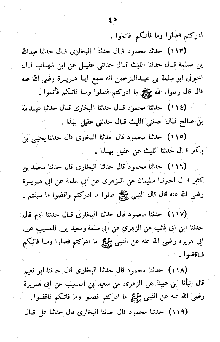 111 - حَدَّثَنَا مَحْمُودٌ قَالَ: حَدَّثَنَا الْبُخَارِيُّ قَالَ: حَدَّثَنَا عَبْدُ اللَّهِ بْنُ مَسْلَمَةَ، قَالَ: حَدَّثَنَا اللَّيْثُ، قَالَ: حَدَّثَنِي عُقَيْلٌ، عَنِ ابْنِ شِهَابٍ، قَالَ: أَخْبَرَنِي أَبُو سَلَمَةَ بْنُ عَبْدِ الرَّحْمَنِ، أَنَّهُ سَمِعَ أَبَا هُرَيْرَةَ، رَضِيَ اللَّهُ عَنْهُ قَالَ: قَالَ رَسُولُ اللَّهِ صَلَّى اللَّهُ عَلَيْهِ وَسَلَّمَ: «§مَا أَدْرَكْتُمْ فَصَلُّوا وَمَا فَاتَكُمْ فَأَتِمُّوا» حَدَّثَنَا مَحْمُودٌ قَالَ: حَدَّثَنَا الْبُخَارِيُّ قَالَ: حَدَّثَنَا عَبْدُ اللَّهِ بْنُ صَالِحٍ، قَالَ: حَدَّثَنِي اللَّيْثُ، قَالَ: حَدَّثَنِي عُقَيْلٌ، بِهَذَا حَدَّثَنَا مَحْمُودٌ قَالَ: حَدَّثَنَا الْبُخَارِيُّ قَالَ: حَدَّثَنَا يَحْيَى بْنُ بُكَيْرٍ، قَالَ: حَدَّثَنَا اللَّيْثُ، عَنْ عُقَيْلٍ، بِهَذَا