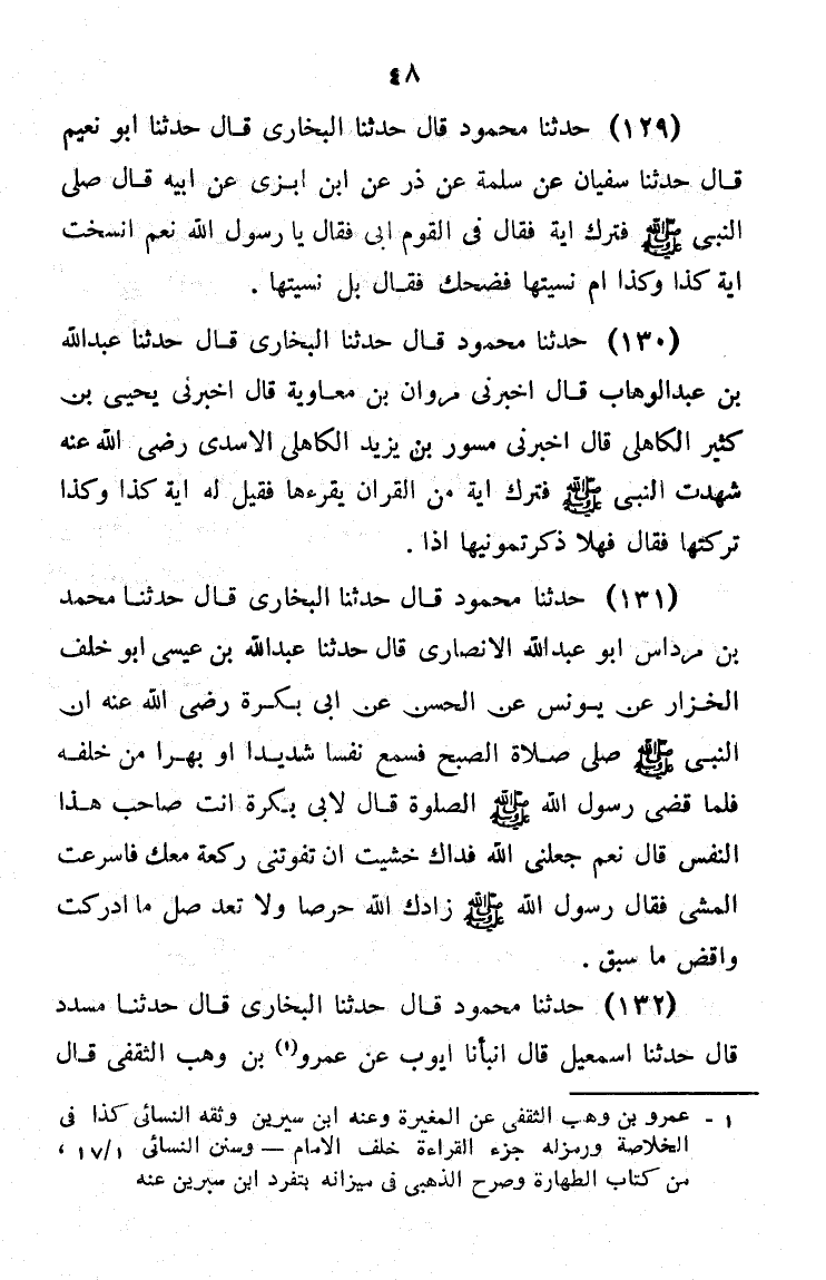 126 - حَدَّثَنَا مَحْمُودٌ حَدَّثَنَا الْبُخَارِيُّ قَالَ: حَدَّثَنَا مُسَدَّدٌ، قَالَ: حَدَّثَنَا إِسْمَاعِيلُ، قَالَ: أَنْبَأَنَا أَيُّوبُ، عَنْ عَمْرِو بْنِ وَهْبٍ الثَّقَفِيِّ، قَالَ: -[49]- كُنَّا عِنْدَ الْمُغِيرَةِ، فَقِيلَ: هَلْ أَمَّ النَّبِيَّ صَلَّى اللَّهُ عَلَيْهِ وَسَلَّمَ أَحَدٌ غَيْرُ أَبِي بَكْرٍ؟ قَالَ: «§كُنَّا مَعَ النَّبِيِّ صَلَّى اللَّهُ عَلَيْهِ وَسَلَّمَ فِي سَفَرٍ ثُمَّ رَكِبْنَا فَأَدْرَكَنَا النَّاسَ وَقَدْ أُقِيمَتْ فَتَقَدَّمَ عَبْدُ الرَّحْمَنِ بْنُ عَوْفٍ وَصَلَّى بِهِمْ رَكْعَةً وَهُمْ فِي الثَّانِيَةِ، فَذَهَبْتُ أُوذِنُهُ فَنَهَانِي فَصَلَّيْنَا الرَّكْعَةَ الَّتِي أَدْرَكْنَا وَقَضَيْنَا الرَّكْعَةَ الَّتِي سُبِقْنَا»