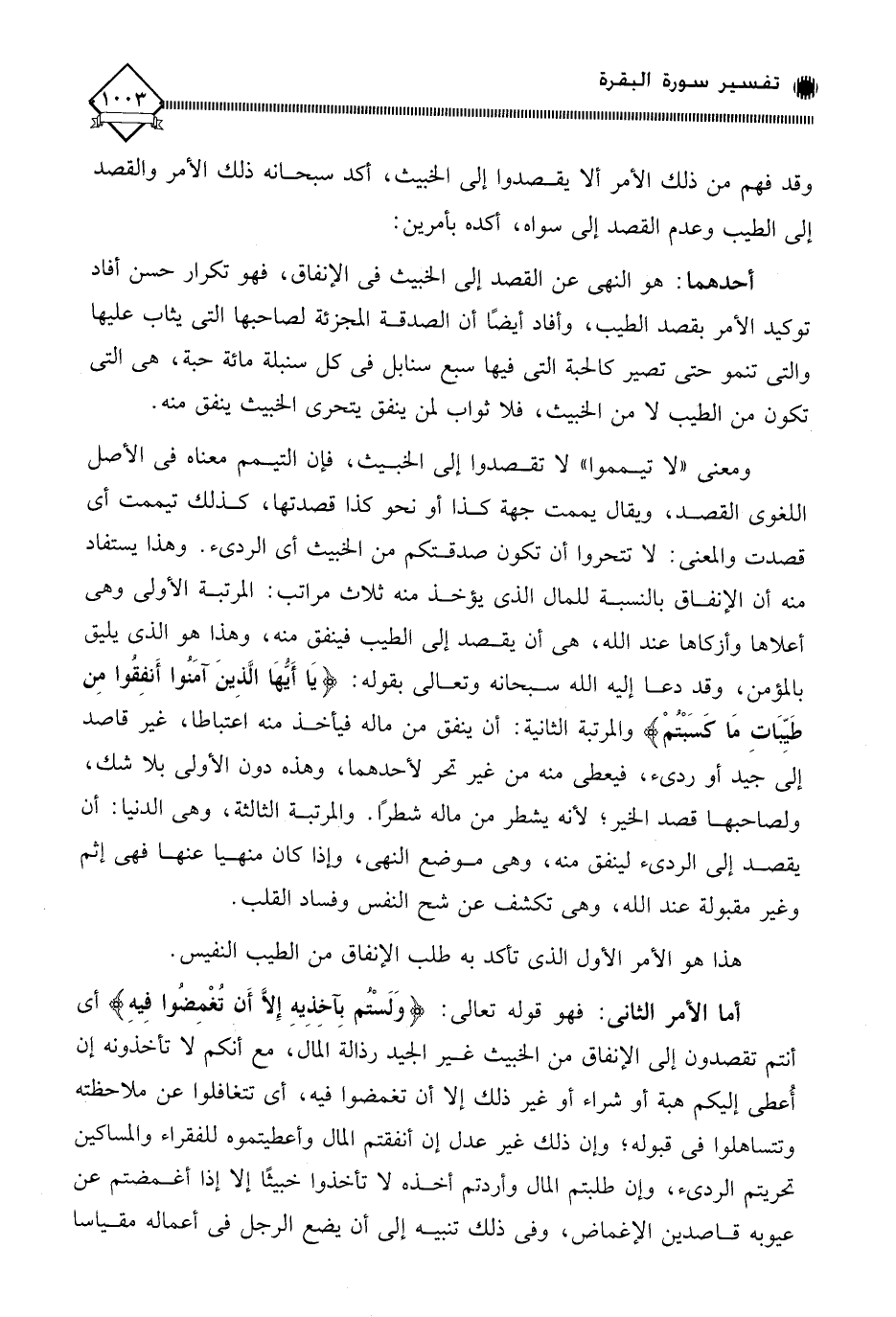 ومعنى " لا تيمموا " لَا تقصدوا إلى الخبيث، فإن التيمم معناه في الأصل اللغوي القصد، ويقال يممت جهة كذا أو نحو كذا قصدتها، كذلك تيممت أي قصدت والمعنى: لَا تتحروا أن تكون صدقتكم من الخبيث أي الرديء. وهذا يستفاد منه أن الإنفاق بالنسبة للمال الذي يؤخذ منه ثلاث مراتب: المرتبة الأولى وهي أعلاها وأزكاها عند الله، هي أن يقصد إلى الطيب فينفق منه، وهذا هو الذي يليق بالمؤمن، وقد دعا إليه الله سبحانه وتعالى بقوله: (يَا أَيُّهَا الَّذِينَ آمَنوا أَنفِقوا مِن طَيِّبَاتِ مَا كَسَبْتمْ) والمرتبة الثانية: أن ينفق من ماله فيأخذ منه اعتباطا، غير قاصد إلى جيد أو رديء، فيعطي منه من غير تحر لأحدهما، وهذه دون الأولى بلا شك، ولصاحبها قصد الخير؛ لأنه يشطر من ماله شطرًا. والمرتبة الثالثة، وهي الدنيا: أن يقصد إلى الرديء لينفق منه، وهي موضع النهي، وإذا كان منهيًّا عنها فهي إثم وغير مقبولة عند الله، وهي تكشف عن شح النفس وفساد القلب.