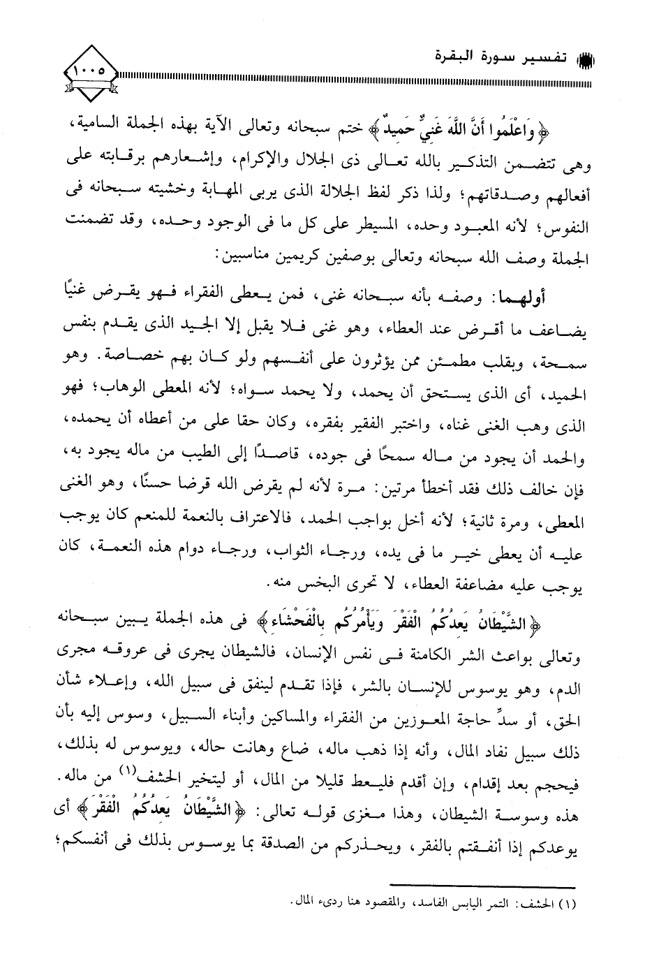 (الشَّيْطَانُ يَعِدُكُمُ الْفَقْرَ وَيَأْمُرُكُمْ بِالْفَحْشَاءِ ... (268) في هذه الجملة يبين سبحانه وتعالى بواعث الشر الكامنة في نفس الإنسان، فالشيطان يجري في عروقه مجرى الدم، وهو يوسوس للإنسان بالشر، فإذا تقدم لينفق في سبيل الله، وإعلاء شأن الحق، أو سد حاجة المعوزين من الفقراء والمساكين وأبناء السبيل، وسوس إليه بأن ذلك سبيل نفاد المال، وأنه إذا ذهب ماله، ضاع وهانت حاله، ويوسوس له بذلك، فيحجم بعد إقدام، وإن أقدم فليعط قليلا من المال، أو ليتخير الحشف (¬1) من ماله. هذه وسوسة الشيطان، وهذا مغزى قوله تعالى: (الشَّيْطَانُ يَعِدُكُمُ الْفَقْرَ) أي يوعدكم إذا أنفقتم بالفقر، ويحذركم من الصدقة بما يوسوس بذلك في أنفسكم؛