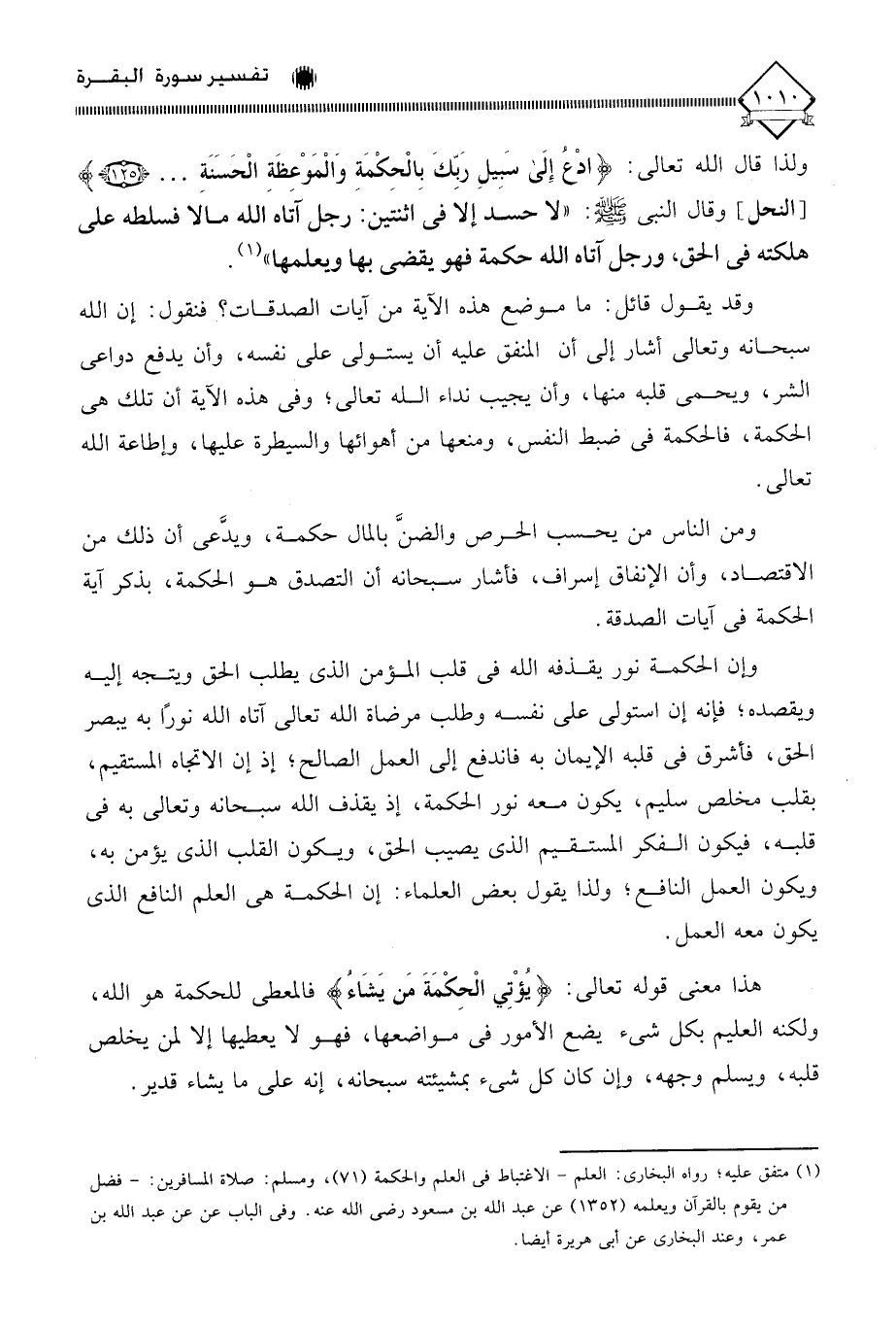 ولذا قال الله تعالى (ادْعُ إِلَى سَبِيلِ رَبِّكَ بِالْحِكْمَةِ وَالْمَوْعِظَةِ الْحَسَنَةِ ... )، وقال النبي - صلى الله عليه وسلم -: " لا حسد إلا في اثنتين: رجل آتاه الله مالًا فسلطه على هلكته في الحق، ورجل آتاه الله حكمة فهو يقضي بها ويعلمها " (¬1).