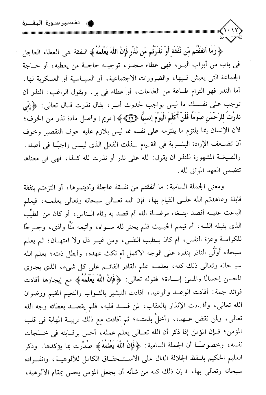 ومعنى الجملة السامية: ما أنفقتم من نفقة عاجلة وأديتموها، أو التزمتم بنفقة قابلة وعاهدتم الله على القيام بها، فإن الله تعالى سبحانه وتعالى يعلمه، فيعلم الباعث عليه أقصد ابتغاء مرضاة الله أم قصد به رئاء الناس، أو كان من الطيِّب الذي يقبله الله، أم تيمم الخبيث فلم يختر لله سواه، وأتبعه مَنًّا وأذى، وجرحًا للكرامة وعزة النفس، أم كان بطيب النفس، ومن غير ذل ولا امتهان؛ ثم يعلم سبحانه أَوَفَّى الناذر بنذره على الوجه الأكمل أم نكث عهده، وأبطل ذمته؟ يعلم الله سبحانه وتعالى ذلك كله، يعلمه علم القادر القائم على كل شيء، الذي يجازي المحسن إحسانًا والمسيء إساءة؛ فقوله تعالى: (فَإِنَّ اللَّهَ يَعْلَمُهُ) مع إيجازها أفادت فوائد جمة: أفادت الوعد والوعيد، أفادت التبشير بالثواب والنعيم المقيم ورضوان الله تعالى، وأفادت الإنذار بالعقاب، لمن فسد قلبه، فلم يقصد بعطائه وجه الله تعالى، ولمن نقض عهده، وأخلَّ بذمته؛ ثم أفادت مع ذلك تربية المهابة في قلب المؤمن؛ فإن المؤمن إذا ذكر أن الله تعالى يعلم عمله، أحس برقابته في خلجات نفسه، وخصوصًا أن الجملة السامية: (فَإِنَّ اللَّهَ يَعْلَمُهُ) صُدِّرت بما يؤكدها. وذكر العليم الحكيم بلفظ الجلالة الدال على الاستحقاق الكامل للألوهية، وانفراده سبحانه وتعالى بها، فإن ذلك كله من شأنه أن يجعل المؤمن يحس بمقام الألوهية،