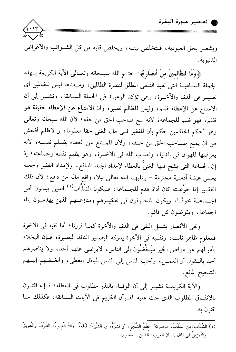 (وَمَا لِلظَّالِمِينَ مِنْ أَنصَارٍ): ختم الله سبحانه وتعالى الآية الكريمة بهذه الجملة السامية التي تفيد النفي المطلق لنصرة الظالمين، ومعناها ليس للظالمين أي نصير في الدنيا والآخرة، وهي تؤكد الوعيد في الجملة السابقة، وتشير إلى أن الامتناع عن الإعطاء ظلم، وليس للظالم نصير؛ وأن الامتناع عن الإعطاء حقيقة هو ظلم، فهو ظلم للجماعة، لأنه منع صاحب الحق من حقه؛ لأن الله سبحانه وتعالى وهو أحكم الحاكمين حكم بأن للفقير في مال الغني حقا معلوما، ولا ظلم أفحش من أن يمنع صاحب الحق من حقه، ولأن الممتنع عن العطاء يظلم نفسه؛ لأنه يعرضها للهوان في الدنيا، ولعذاب الله في الآخرة، وهو يظلم نفسه وجماعته؛ إذ إن الجماعة التي يشح فيها الغنيُّ بالعطاء لإمداد الجند المدافع، ولإمداد الفقير وجعله يعيش عيشة آدمية محترمة - يبتليها الله تعالى ببلاء واقع ماله من دافع، لأن ذلك الفقير إذا جوَّعته كان أداة هدم للجماعة، فيكون الشُّذَّاب (¬1) الذين يبدلون أمن الجماعة خوفًا، ويكون المنحرفون في تفكيرهم ومنازعهم الذين يهدمون بناء الجماعة، ويقوضون كل قائم.