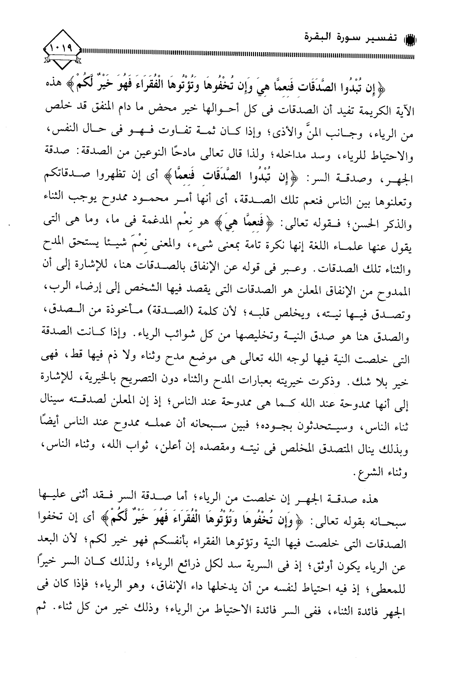 هذه صدقة الجهر إن خلصت من الرياء؛ أما صدقة السر فقد أثنى عليها سبحانه بقوله تعالى: (وَإِن تُخْفُوهَا وَتُؤْتُوهَا الْفُقَرَاءَ فَهُوَ خَيْرٌ لكُمْ) أي إن تخفوا الصدقات التي خلصت فيها النية وتؤتوها الفقراء بأنفسكم فهو خير لكم؛ لأن البعد عن الرياء يكون أوثق؛ إذ في السرية سد لكل ذرائع الرياء، ولذلك كان السر خيرًا للمعطي؛ إذ فيه احتياط لنفسه من أن يدخلها داء الإنفاق، وهو الرياء؛ فإذا كان في الجهر فائدة الثناء، ففي السر فائدة الاحتياط من الرياء؛ وذلك خير من كل ثناء. ثم