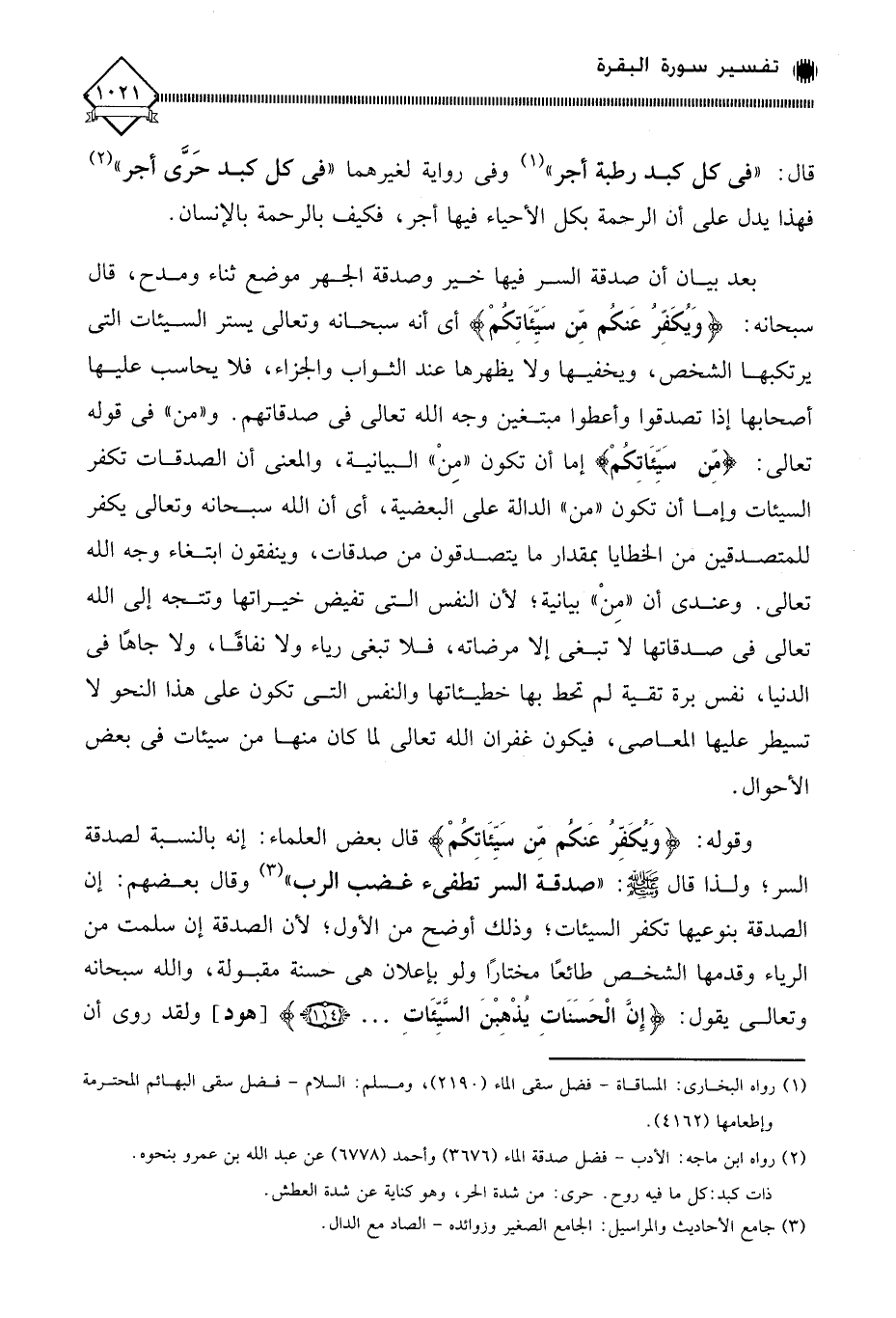بعد بيان أن صدقة السر فيها خير وصدقة الجهر موضع ثناء ومدح، قال سبحانه: (وَيُكَفِّرُ عَنكُم مِّن سَيِّئَاتِكُمْ) أي أنه سبحانه وتعالى يستر السيئات التي يرتكبها الشخص، ويخفيها ولا يظهرها عند الثواب والجزاء، فلا يحاسب عليها أصحابها إذا تصدقوا وأعطوا مبتغين وجه الله تعالى في صدقاتهم. و " من " في قوله تعالى: (مِّن سَيِّئَاتِكُمْ) إما أن تكون " مِنْ " البيانية، والمعنى أن الصدقات تكفر السيئات وإما أن تكون " من " الدالة على البعضية، أي أن الله سبحانه وتعالى يكفر للمتصدقين من الخطايا بمقدار ما يتصدقون من صدقات، وينفقون ابتغاء وجه الله تعالى. وعندي أن " مِنْ " بيانية؛ لأن النفس التي تفيض خيراتها وتتجه إلى الله تعالى في صدقاتها لَا تبغي إلا مرضاته، فلا تبغي رياء ولا نفاقًا، ولا جاهًا في الدنيا، نفس برة تقية لم تحط بها خطيئاتها والنفس التي تكون على هذا النحو لا تسيطر عليها المعاصي، فيكون غفران الله تعالى لما كان منها من سيئات في بعض الأحوال.