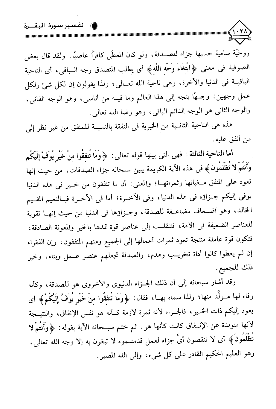 وقد أشار سبحانه إلى أن ذلك الجزاء الدنيوي والأخروي هو للصدقة، وكأنه وفاء لها مولَّد منها؛ ولذا سماه بها، فقال: (وَمَا تُنفِقُوا مِنْ خَيْرٍ يُوَفَّ إِلَيْكمْ) أي يعود إليكم ذات الخير، فالجزاء لأنه ثمرة لازمة كأنه هو نفس الإنفاق، والنتيجة لأنها متولدة عن الإنفاق كانت كأنها هو. ثم ختم سبحانه الآية بقوله: (وَأَنتُمْ لا تُظْلَمُونَ) أي لَا تنقصون أي جزاء لعمل قدمتموه لَا تبغون به إلا وجه الله تعالى، وهو العليم الحكيم القادر على كل شيء، وإلى الله المصير.