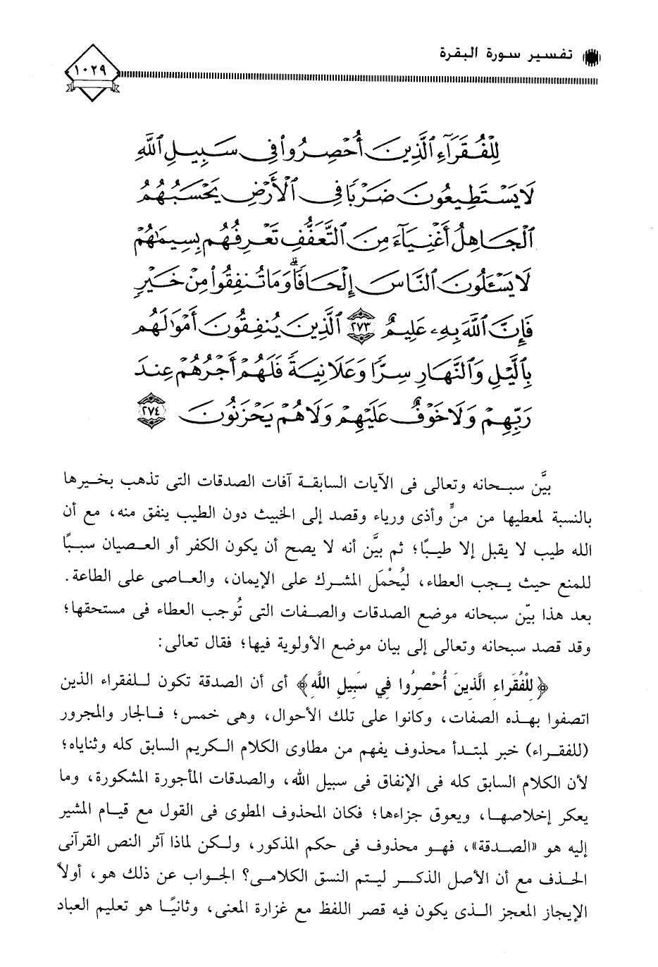 (لِلْفُقَرَاءِ الَّذِينَ أُحْصِرُوا فِي سَبِيلِ اللَّهِ لَا يَسْتَطِيعُونَ ضَرْبًا فِي الْأَرْضِ يَحْسَبُهُمُ الْجَاهِلُ أَغْنِيَاءَ مِنَ التَّعَفُّفِ تَعْرِفُهُمْ بِسِيمَاهُمْ لَا يَسْأَلُونَ النَّاسَ إِلْحَافًا وَمَا تُنْفِقُوا مِنْ خَيْرٍ فَإِنَّ اللَّهَ بِهِ عَلِيمٌ (273) الَّذِينَ يُنْفِقُونَ أَمْوَالَهُمْ بِاللَّيْلِ وَالنَّهَارِ سِرًّا وَعَلَانِيَةً فَلَهُمْ أَجْرُهُمْ عِنْدَ رَبِّهِمْ وَلَا خَوْفٌ عَلَيْهِمْ وَلَا هُمْ يَحْزَنُونَ (274)