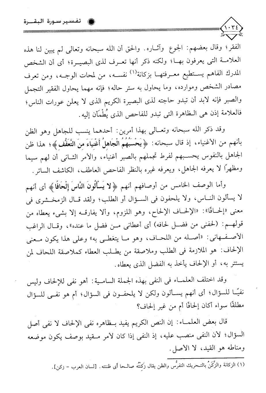 الفقر؛ وقال بعضهم الجوع وآثاره والحق أن الله سبحانه وتعالى لم يبين لنا هذه العلامة التي يعرفون بها؛ ولكنه ذكر أنها تعرف لذي البصيرة؛ أي أن الشخص المدرك الفاهم يستطيع معرفتها بزكانة (¬1) نفسه، من لمحات الوجه، ومن تعرف مصادر الشخص وموارده، وما يحاول به ستر حاله؛ فإنه مهما يحاول الفقير التجمل والصبر فإنه لابد أن تبدو حاجته لذي البصيرة الكريم الذي لَا يعلن عورات الناس؛ فالعلامة إذن هي الظاهرة التي تبدو للفاحص الذي يُطْمَأن إليه.