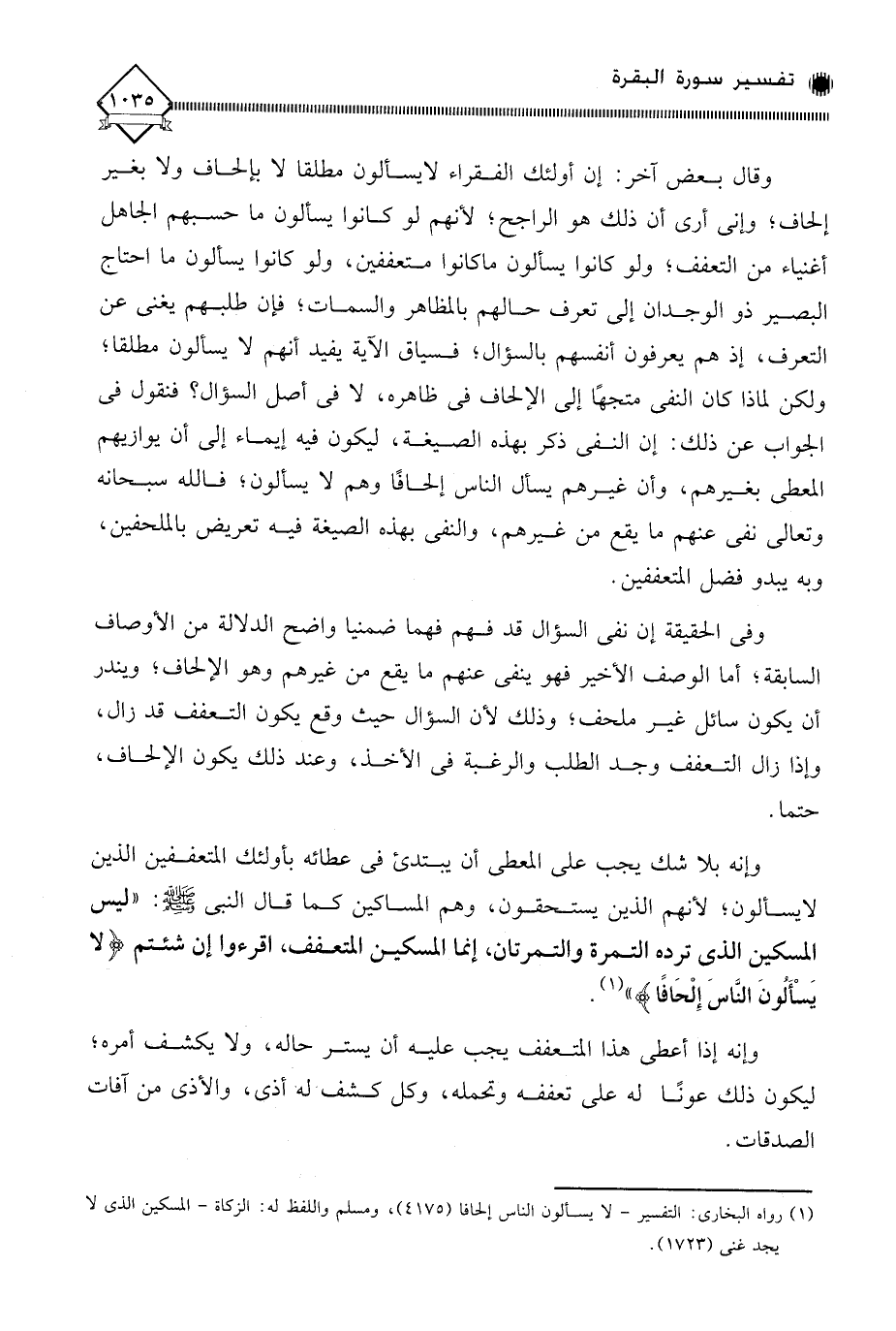 وقال بعض آخر: إن أولئك الفقراء لَا يسألون مطلقا لَا بإلحاف ولا بغير إلحاف؛ وإني أرى أن ذلك هو الراجح؛ لأنهم لو كانوا يسألون ما حسبهم الجاهل أغنياء من التعفف؛ ولو كانوا يسألون ما كانوا متعففين، ولو كانوا يسألون ما احتاج البصير ذو الوجدان إلى تعرف حالهم بالمظاهر والسمات؛ فإن طلبهم يغني عن التعرف، إذ هم يعرفون أنفسهم بالسؤال؛ فسياق الآية يفيد أنهم لَا يسألون مطلقا؛ ولكن لماذا كان النفي متجهًا إلى الإلحاف في ظاهره، لَا في أصل السؤال؟ فنقول في الجواب عن ذلك: إن النفي ذكر بهذه الصيغة، ليكون فيه إيماء إلى أن يوازيهم المعطي بغيرهم، وأن غيرهم يسأل الناس إلحافًا وهم لَا يسألون، فالله سبحانه وتعالى نفَى عنهم ما يقع من غيرهم، والنفي بهذه الصيغة فيه تعريض بالملحفين، وبه يبدو فضل المتعففين.