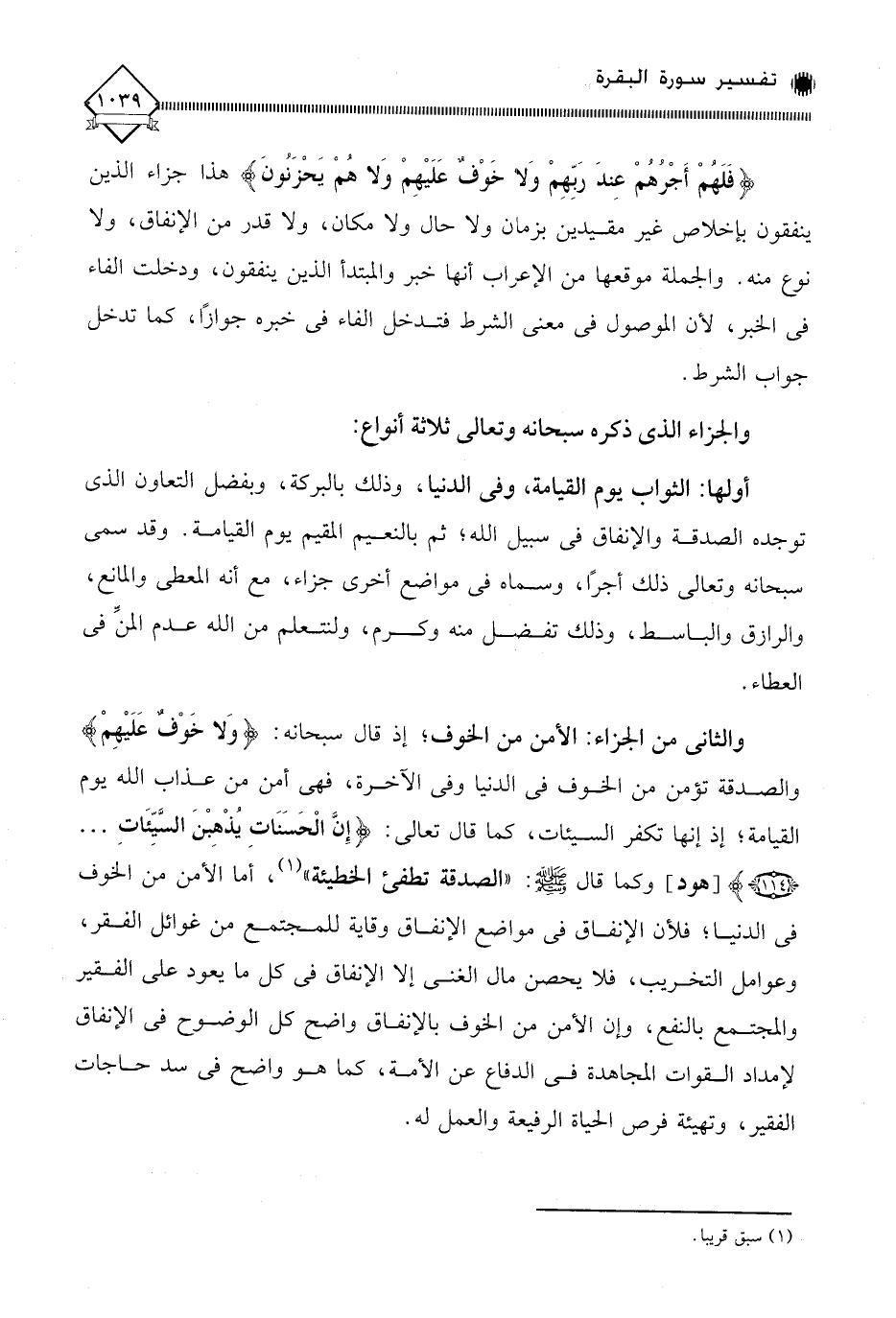 والثاني من الجزاء: الأمن من الخوف؛ إذ قال سبحانه: (وَلا خَوْفٌ عَلَيْهِمْ) والصدقة تؤمن من الخوف في الدنيا وفي الآخرة، فهي أمن من عذاب الله يوم القيامة؛ إذ إنها تكفر السيئات، كما قال تعالى: (إِنَّ الْحَسَنَاتِ يُذْهِبْنَ السَّيِّئَاتِ. . .)، وكما قال - صلى الله عليه وسلم -: " الصدقة تطفئ الخطيئة " (¬1)، أما الأمن من من الخوف في الدنيا، فلأن الإنفاق في مواضع الإنفاق وقاية للمجتمع من غوائل الفقر، وعوامل التخريب، فلا يحصن مال الغني إلا الإنفاق في كل ما يعود على الفقير والمجتمع بالنفع، وإن الأمن من الخوف بالإنفاق واضح كل الوضوح في الإنفاق لإمداد القوات المجاهدة في الدفاع عن الأمة، كما هو واضح في سد حاجات الفقير، وتهيئة فرص الحياة الرفيعة والعمل له.