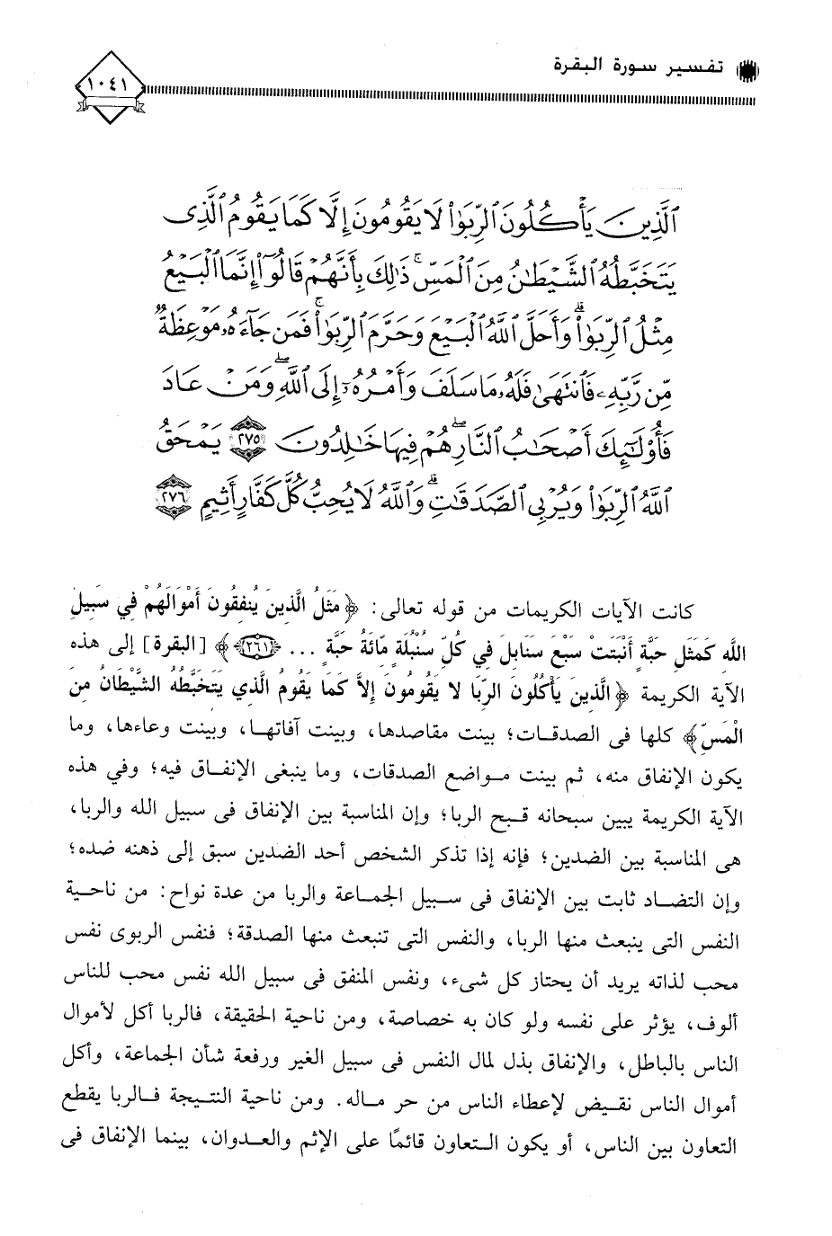 (الَّذِينَ يَأْكُلُونَ الرِّبَا لَا يَقُومُونَ إِلَّا كَمَا يَقُومُ الَّذِي يَتَخَبَّطُهُ الشَّيْطَانُ مِنَ الْمَسِّ) كلها في الصدقات؛ بينت مقاصدها، وبينت آفاتها، وبينت وعاءها، وما يكون الإنفاق منه، ثم بينت مواضع الصدقات، وما ينبغي الإنفاق فيه؛ وفي هذه الآية الكريمة يبين سبحانه قبح الربا، وإن المناسبة بين الإنفاق في سبيل الله والربا، هي المناسبة بين الضدين؛ فإنه إذا تذكر الشخص أحد الضدين سبق إلى ذهنه ضده؛ وإن التضاد ثابت بين الإنفاق في سبيل الجماعة والربا من عدة نواح: من ناحية النفس التي ينبعث منها الربا، والنفس التي تنبعث منها الصدقة، فنفس الربوي نفس محب لذاته يريد أن يحتاز كل شيء، ونفس المنفق في سبيل الله نفس محب للناس ألوف، يؤثر على نفسه ولو كان به خصاصة، ومن ناحية الحقيقة، فالربا أكل لأموال الناس بالباطل، والإنفاق بذل لمال النفس في سبيل الغير ورفعة شأن الجماعة، وأكل أموال الناس نقيض لإعطاء الناس من حر ماله. ومن ناحية النتيجة فالربا يقطع التعاون بين الناس، أو يكون التعاون قائمًا على الإثم والعدوان، بينما الإنفاق في