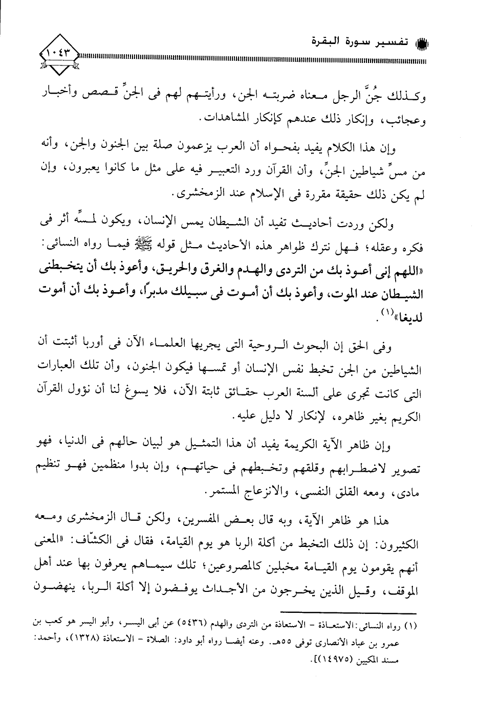وفى الحق إن البحوث الروحية التي يجريها العلماء الآن في أوربا أثبتت أن الشياطين من الجن تخبط نفس الإنسان أو تمسها فيكون الجنون، وأن تلك العبارات التي كانت تجري على ألسنة العرب حقائق ثابتة الآن، فلا يسوغ لنا أن نؤول القرآن الكريم بغير ظاهره، لإنكار لَا دليل عليه.