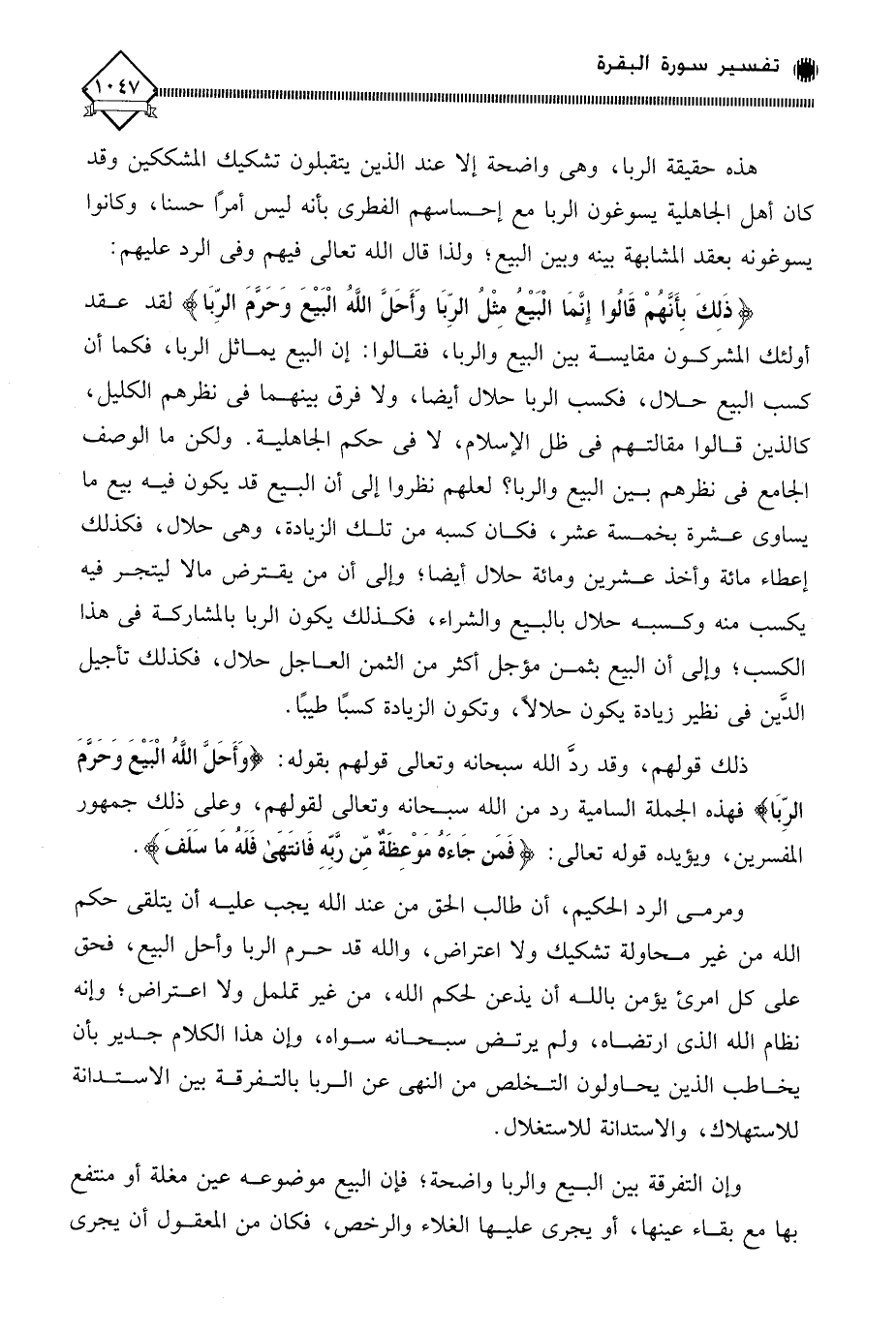 ذلك قولهم، وقد ردَّ الله سبحانه وتعالى قولهم بقوله: (وَأَحَلَّ اللَّهُ الْبَيْعَ وَحَرَّمَ الرِّبَا) فهذه الجملة السامية رد من الله سبحانه وتعالى لقولهم، وعلى ذلك جمهور المفسرين، ويؤيده قوله تعالى: (فَمَن جَاءَهُ مَوْعِظَةٌ من رَّبِّهِ فَانتَهَى فَلَهُ مَا سَلَفَ).