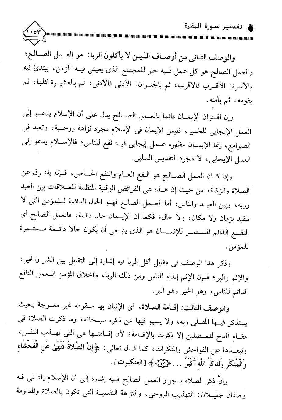 وإنَّ ذكر الصلاة بجوار العمل الصالح فيه إشارة إلى أن الإسلام يلتقى فيه وصفان جليلان: التهذيب الروحي، والنزاهة النفسية التي تكون بالصلاة والمداومة