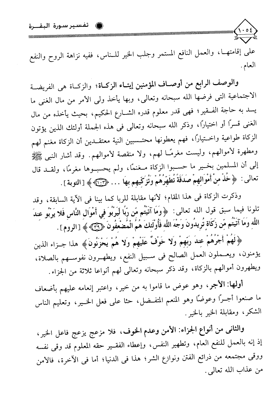 والوصف الرابع من أوصاف المؤمنين إيتاء الزكاة، والزكاة هي الفريضة الاجتماعية التي فرضها الله سبحانه وتعالى، وبها يأخذ ولي الأمر من مال الغني ما يسد به حاجة الفقير، فهي قدر معلوم قدره الشارع الحكيم، بحيث يأخذه من مال الغني قسرًا أو اختيارًا، وذكر الله سبحانه وتعالى في هذه الجملة أولئك الذين يؤتون الزكاة طواعية واختيارًا، فهم يعطونها محتسبين النية معتقدين أن الزكاة مغنم لهم ومطهرة لأموالهم، وليست مغرمًا لهم، ولا منقصة لأموالهم. وقد أشار النبي - صلى الله عليه وسلم - إلى أن المسلمين بخير ما حسبوا الزكاة مغنمًا، ولم يحسبوها مغرمًا، ولقد قال تعالى: (خُذْ مِنْ أَموَالِهِمْ صَدَقَةً تُطَهِّرُهُمْ وَتُزَكِيهِم بِهَا. . .).