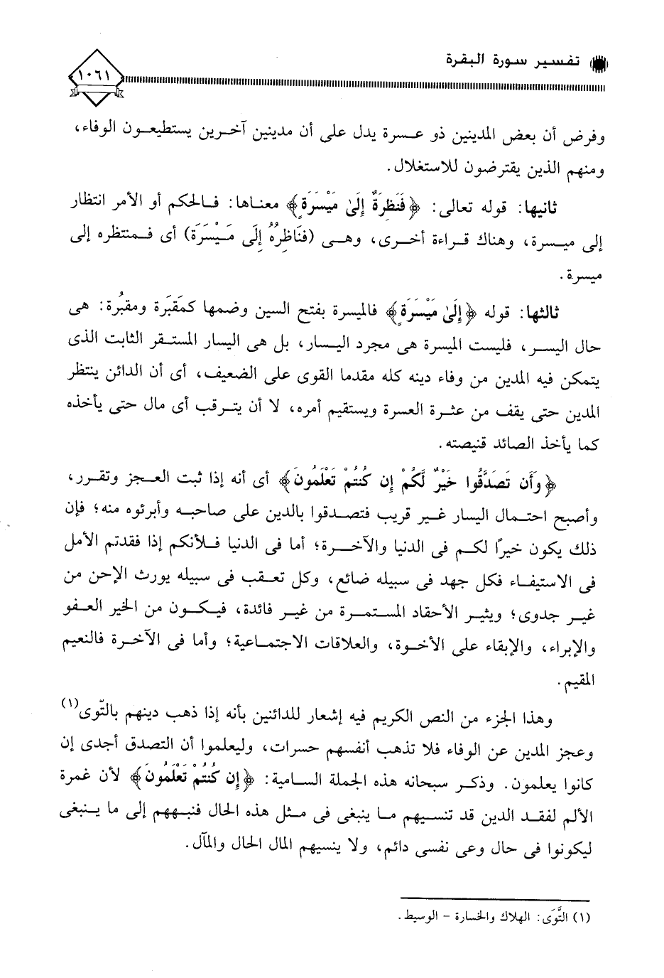 ثالثها: قوله (إِلَى مَيْسَرَةٍ) فالميسرة بفتح السين وضمها كمَقبَرة ومقبُرة: هي حال اليسر، فليست الميسرة هي مجرد اليسار، بل هي اليسار المستقر الثابت الذي يتمكن فيه المدين من وفاء دينه كله مقدما القوي على الضعيف، أي أن الدائن ينتظر المدين حتى يقف من عثرة العسرة ويستقيم أمره، لَا أن يترقب أي مال حتى يأخذه كما يأخذ الصائد قنيصته.
