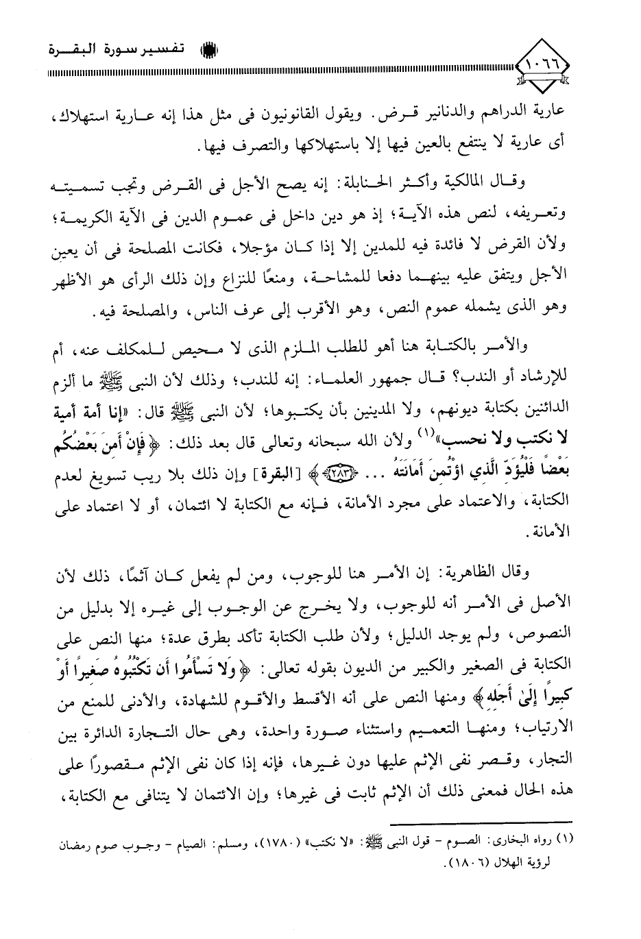 والأمر بالكتابة هنا أهو للطلب الملزم الذي لَا محيص للمكلف عنه، أم للإرشاد أو الندب؟ قال جمهور العلماء: إنه للندب؛ وذلك لأن النبي - صلى الله عليه وسلم - ما ألزم الدائنين بكتابة ديونهم، ولا المدينين بأن يكتبوها، لأن النبي - صلى الله عليه وسلم - قال: " إنا أمة أمية لا نكتب ولا نحسب " (¬1) ولأن الله سبحانه وتعالى قال بعد ذلك: (فَإِنْ أَمِنَ بَعْضُكم بَعْضًا فَلْيُؤَدِّ الَّذِي اؤْتُمِنَ أَمَانتَهُ. . .)، وإن ذلك بلا ريب تسويغ لعدم الكتابة، والاعتماد على مجرد الأمانة، فإنه مع الكتابة لَا ائتمان، أو لَا اعتماد على الأمانة.