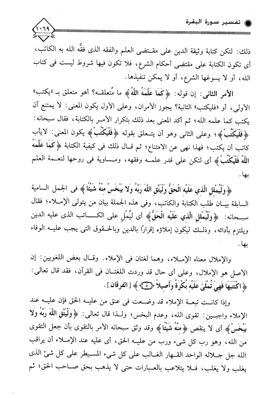 الأمر الثاني: إن قوله: (كَمَا عَلَّمَهُ اللَّهُ) ما مُتعلقه؟ أهو متعلق بـ " يكتب " الأولى، أو " فليكتب " الثانية؟ يجوز الأمران، وعلى الأول يكون المعنى: لَا يمتنع أن يكتب كما علمه الله؛ ثم أكد المعنى بعد ذلك بتكرار الأمر بالكتابة، فقال سبحانه: (فَلْيَكْتُبْ)؛ وعلى الثاني وهو أن يتعلق بقوله (فَلْيَكْتبْ) يكون المعنى: لَا يأب كاتب أن يكتب؛ فهذا نهي عن الامتناع؛ ثم قال ذلك في كيفية الكتابة (كَمَا عَلَّمَهُ اللَّهُ فَلْيَكْتُبْ) أي لتكن على قدر علمه وفقهه، ومساوية في روحها لنعمة العلم بها.