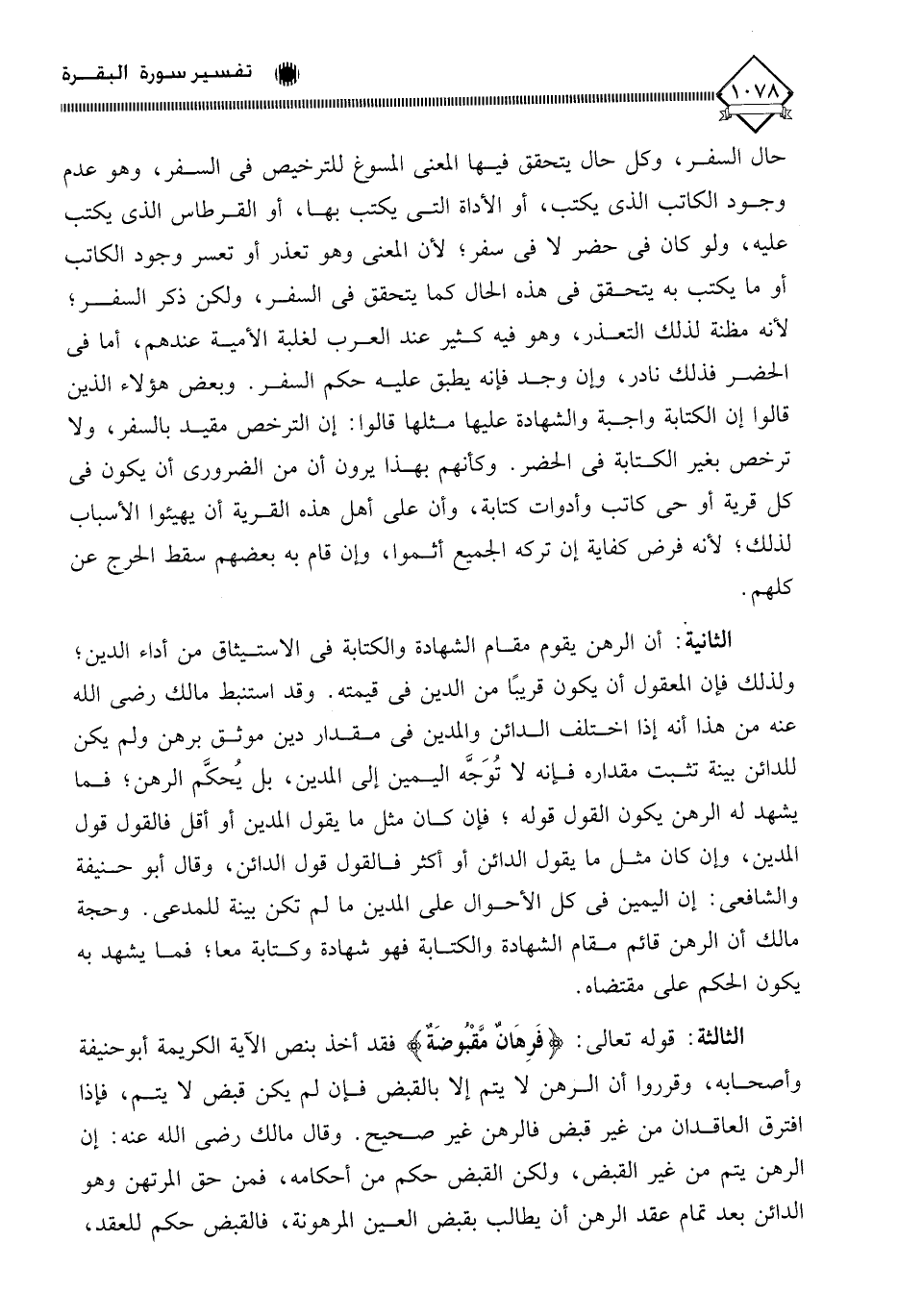حال السسفر، وكل حال يتحقق فيها المعنى المسوغ للترخيص في السفر، وهو عدم وجود الكاتب الذي يكتب، أو الأداة التي يكتب بها، أو القرطاس الذي يكتب عليه، ولو كان في حضر لَا في سفر، لأن المعنى وهو تعذر أو تعسر وجود الكاتب أو ما يكتب به يتحقق في هذه الحال كما يتحقق في السفر، ولكن ذكر السفر، لأنه مظنة لذلك التعذر، وهو فيه كثير عند العرب لغلبة الأمية عندهم، أما في الحضر فذلك نادر، وإن وجد فإنه يطبق عليه حكم السفر. وبعض هؤلاء الذين قالوا إن الكتابة واجبة والشهادة عليها مثلها قالوا: إن الترخص مقيد بالسفر، ولا ترخص بغير الكتابة في الحضر. وكأنهم بهذا يرون أن من الضروري أن يكون في كل قرية أو حي كاتب وأدوات كتابة، وأن على أهل هذه القرية أن يهيئوا الأسباب لذلك؛ لأنه فرض كفاية إن تركه الجميع أثموا، وإن قام به بعضهم سقط الحرج عن كلهم.