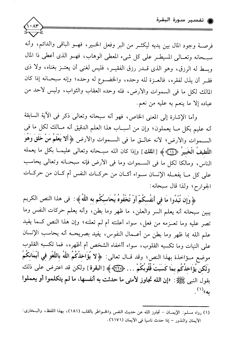 (وَإِن تُبْدُوا مَا فِي أَنفُسِكُمْ أَوْ تُخْفُوهُ يُحَاسِبْكُم بِهِ اللَّهُ): في هذا النص الكريم يبين سبحانه أنه يعلم السر والعلن، ما ظهر وما بطن، وأنه يعلم حركات النفس وما تصر عليه وما تعزمه من فعل، سواء أعلنته أم لم تعلنه، وإن هذا النص كما يفيد علم الله بما ظهر وما بطن من أعمال النفوس، يفيد بصريحه أنه يحاسب الإنسان على النيات وما تكسبه القلوب، سواء أأخفاه الشخص أم أظهره، فما تكسبه القلوب موضع مؤاخذة بهذا النص؛ وقد قال تعالى: (لا يُؤَاخِذُكُمُ اللَّهُ بِاللَّغْوِ فِي أَيْمَانِكُمْ وَلَكِن يُؤَاخِذُكُم بمَا كَسَبَتْ قلُوبُكُمْ. . .)، ولكن قد اعترض على ذلك بقول النبي - صلى الله عليه وسلم -: " إن الله تجاوز لأمتي ما حدثت به أنفسها، ما لم يتكلموا أو يعملوا (¬1)