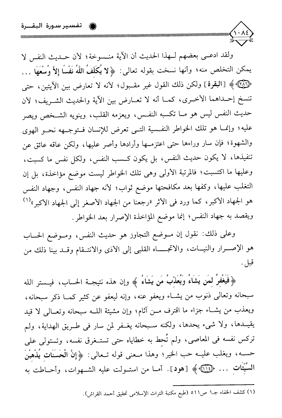 ولقد ادعى بعضهم لهذا الحديث أن الآية منسوخة؛ لأن حديث النفس لا يمكن التخلص منه؛ وأنها نسخت بقوله تعالى: (لا يُكلِّفُ اللَّهُ نَفْسًا إِلَّا وُسْعَهَا. . .)، ولكن ذلك القول غير مقبول؛ لأنه لَا تعارض بين الآيتين، حتى تنسخ إحداهما الأخرى، كما أنه لَا تعارض بين الآية والحديث الشريف؛ لأن حديث النفس ليس هو ما تكسبه النفس، ويعزمه القلب، وينويه الشخص ويصر عليه؛ وإنما هو تلك الخواطر النفسية التي تعرض للإنسان فتوجهه نحو الهوى والشهوة؛ فإن سار وراءها حتى اعتزمها وأرادها وأصر عليها، ولكن عاقه عائق عن تنفيذها، لَا يكون حديث النفس، بل يكون كسب النفس، ولكل نفس ما كسبت، وعليها ما اكتسبت؛ فالمرتبة الأولى وهي تلك الخواطر ليست موضع مؤاخذة، بل إن التغلب عليها، وكفها بعد مكافحتها موضع ثواب؛ لأنه جهاد النفس، وجهاد النفس هو الجهاد الأكبر، كما ورد في الأثر " رجعنا من الجهاد الأصغر إلى الجهاد الأكبر " (¬1) ويقصد به جهاد النفس؛ إنما موضع المؤاخذة الإصرار بعد الخواطر.